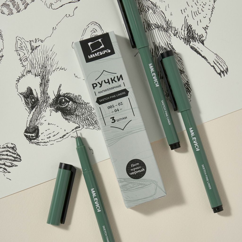 Наборы капиллярных ручек Малевичъ - новая линейка бюджетных линеров. Уменьшенный диаметр корпуса, более легкий пластик, с минималистичным дизайном, в тредновом цвете "мох" В ручках используются специальные водостойкие архивные чернила на пигментной основе с высокой степенью светостойкости и глубоким черным цветом. Рисунок после высыхания не размывается водой и спиртом, линеры можно использовать в смешанной технике с акварелью, акрилом или маркерами. Чернила идентичны линейке Graf'Art в фирменном цвете, ложатся ровно, без пропусков и клякс, быстро сохнут и не размазываются.