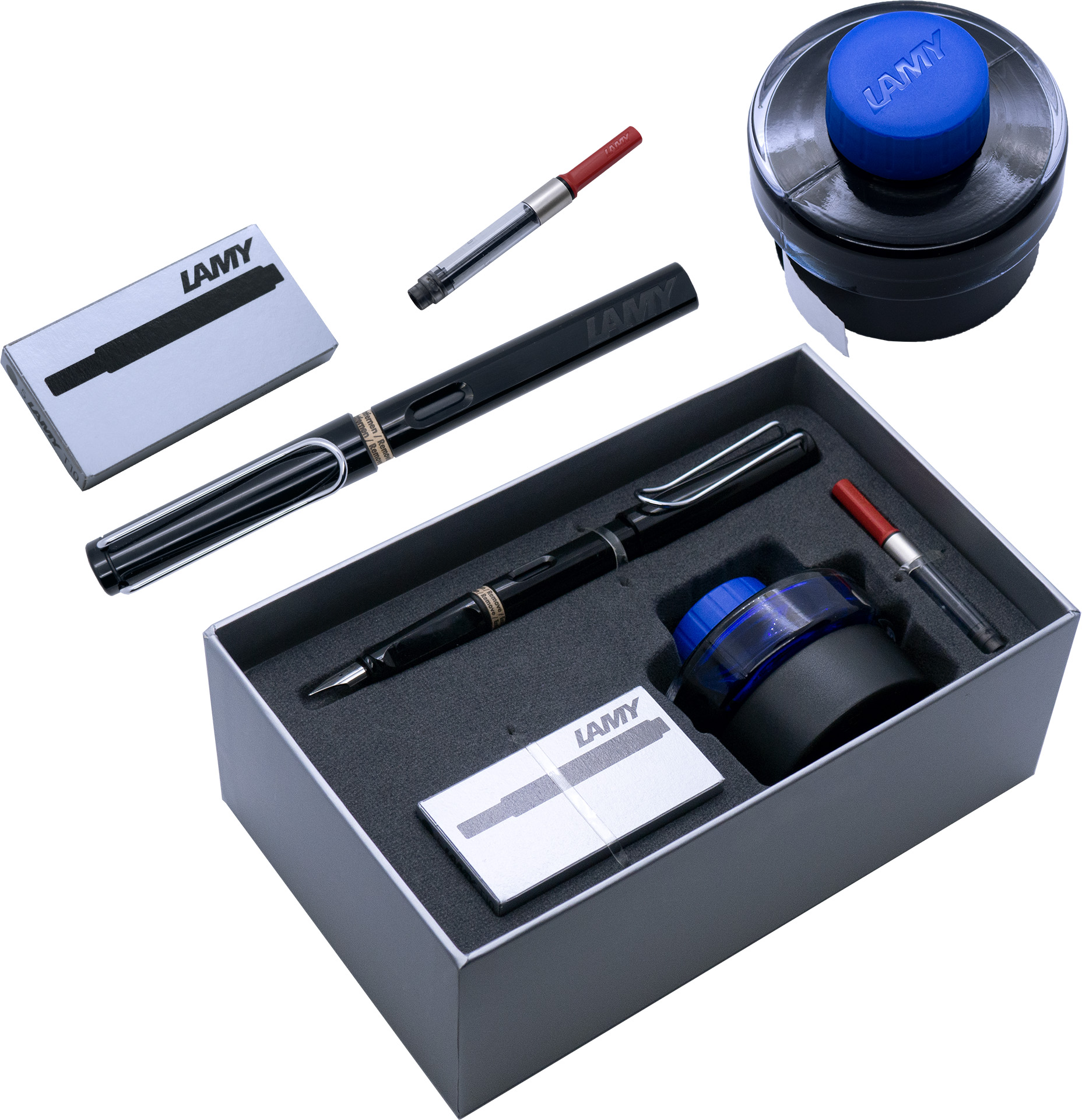 Набор Lamy "Safari" - комплект с набором картриджей, чернилами и конвертером. Модель Lamy Safari создана в 1980 году в коллаборации с дизайнерами и психологами специально для подростков. Сейчас трудно найти в Европе школу или университет, где не писали бы Lamy Safari. В 80-е дизайн этой ручки многим казался немного странным, ни на что непохожим, что, вероятно, и привлекло молодежь, которую уже не устраивал традиционный дизайн обычных ручек. Lamy Safari хорошо показала себя "в деле": ручка пишет практически без нажима, ее эргономика такова, что рука не устает даже от долгого письма. Сейчас этими ручками пишут и рисуют, а также их коллекционируют - помимо широкой гаммы постоянных цветов, каждый год выходит лимитированный выпуск ручек в самом модном цвете. Выполнена из прочного ABS пластика. Эргономичный хват, позволяющий пальцам принять правильное положение при письме. Металлический клип на колпачке напоминает по форме канцелярскую скрепку. Окошко на корпусе позволяет контролировать расход чернил. Стальное заменяемое перо. Перьевая ручка используется с чернильными картриджами Lamy T10 или с конвертером Lamy Z28 для заправки чернилами из флакона Lamy T51 или Lamy T52. Градация перьев Lamy: «EF» (extra fine, примерно 0,5 мм) — супер-тонкое перо, которое часто выбирают художники для скетчей и графики, а также обладатели мелкого почерка. «F» (fine, примерно 0,6 мм) — тонкое перо, универсальный вариант для любителей достаточно тонкой линии. «M» (medium, примерно 0,75 мм) — среднее, даёт более толстую линию, очень неприхотливое перо: пишет при любом наклоне, больше подойдёт обладателям крупного размашистого почерка. «B» (broad, примерно 0,9 мм) — толстое перо, актуально все тоже, что для M, но в более ярких проявлениях. «LH» (left hand, примерно 0,75 мм) — перо, созданное специально для левшей и учитывающее их особенную технику письма: правши «тянут» ручку по бумаге, а левши «толкают» её. Перо «LH» специально скошено таким образом, что левшам удобно им писать. Различие между перьями может чувствоваться при письме: чем тоньше перо, тем меньше подача чернил, суше линия. Также на ширину линии влияет давление при письме — чем сильнее нажим на перо, тем шире линия. У людей, пишущих с разной степенью нажима, пробы одного и того же пера могут выглядеть по-разному.