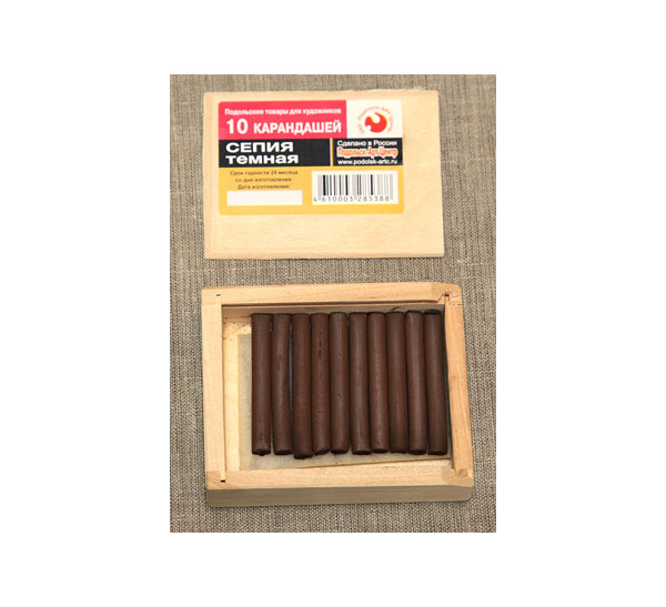 Набор сангины, в состав которой входят специальные железо-окисные пигменты и природная глина. 10 карандашей. Цвет темный. Упаковка: деревянная коробка.