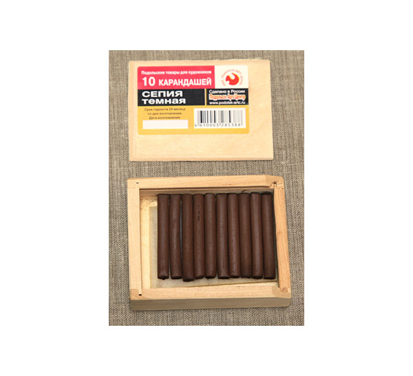 Набор сепии, выпускаемой на основе знаменитой глины из Часов-Яра. 10 карандашей. Цвет темный. Упаковка: деревянная коробка.