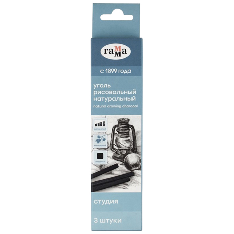 Натуральный уголь для графики, набросков и зарисовок. Деликатный штрих холодного черного цвета. Перекрывается сухими материалами, стирается без следа. Легко ложится на различные текстуры бумаги, холста. Изготовлен путем карбонизации при автоматическим контроле температуры, влажности и степени обжига из виноградной лозы. Длина стержня — 120 мм.