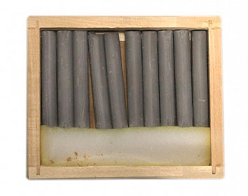 Набор соусов, готовится из глины Часов-Яра, мела и красящего пигмента, а также других добавок. 10 карандашей. Цвет серый теплый. Упаковка: деревянный пенал.