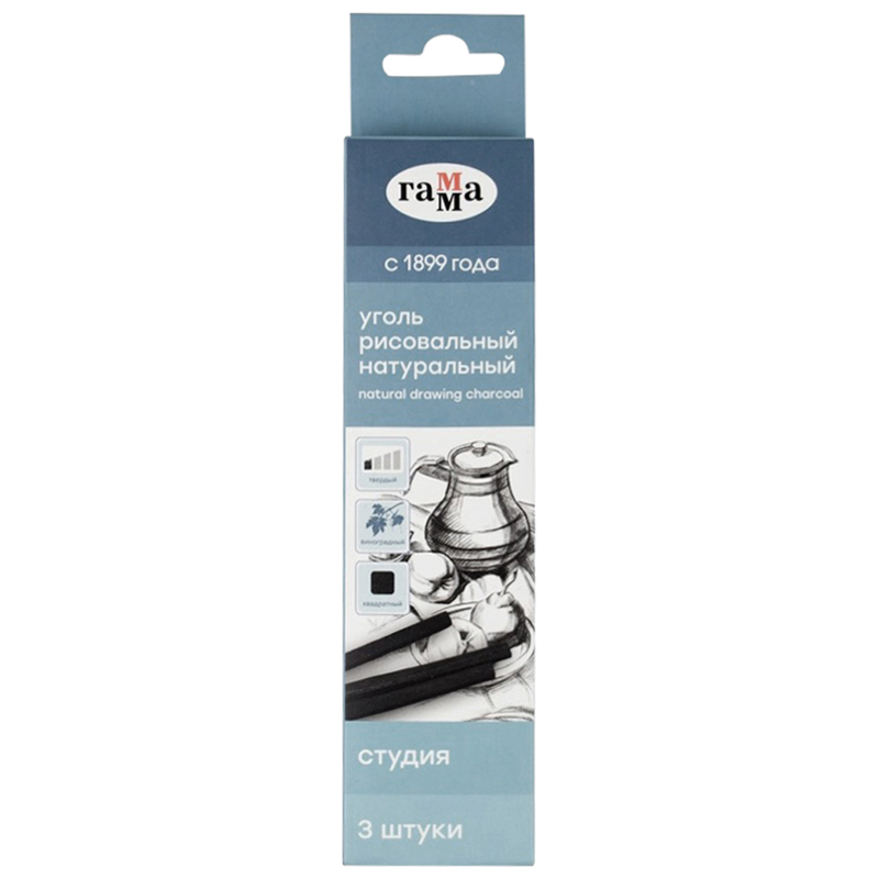 Натуральный уголь для графики, набросков и зарисовок. Деликатный штрих холодного черного цвета. Перекрывается сухими материалами, стирается без следа. Легко ложится на различные текстуры бумаги, холста. Изготовлен путем карбонизации при автоматическим контроле температуры, влажности и степени обжига из виноградной лозы. Длина стержня — 120 мм.