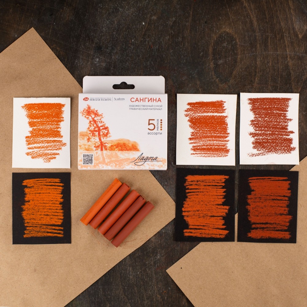 Сухой художественный материал сангина предназначен для выполнения графических работ на бумаге, крафте, тонированной бумаге. Сангина наносится штриховкой и легко растушёвывается по поверхности бумаги. Для внесения исправлений в рисунок сангина удаляется с поверхности бумаги стирательной резинкой, формопластом или клячкой. Для долговечного хранения завершенные работы требуют дополнительного закрепления лаком фиксативом. Длина стержня - 65 мм. Диаметр - 10 мм.