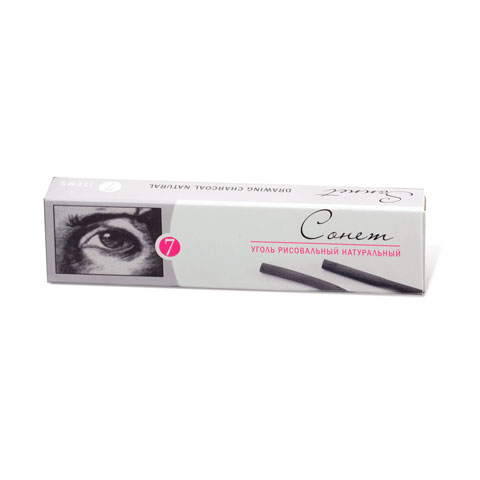 О серии: натуральный уголь «Сонет» представляет собой круглые грифели (угольные палочки) различного диаметра. Производится методом специального обжига, при котором древесина сохраняет свою структуру. Выпускается в различных наборах. Характеристика: имеет мягкую структуру, с лёгкостью наносится на холсты, бумагу, картон и другие поверхности. При необходимости легко удаляется мягким ластиком или клячкой. Применение: может использоваться не только для создания набросков и эскизов, но и как самостоятельное выразительное художественное средство. Производство: изготавливается в Польше под жестким контролем качества.