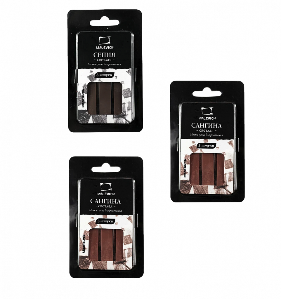 Материалы для художественной графики "Малевичъ" обладают высокой кроющей способностью, работать ими легко и приятно, пигмент мягко ложится на бумагу без особого нажима. В серии 6 вариаций наборов — сангина темная, сангина светлая, сепия светлая, сепия темная, уголь натуральный и уголь прессованный, Такие наборы подходят для рисования эскизов и набросков, так же могут использоваться в качестве самостоятельного материала для полноценных графических работ. Длина мелка 7 см., толщина 1 см.