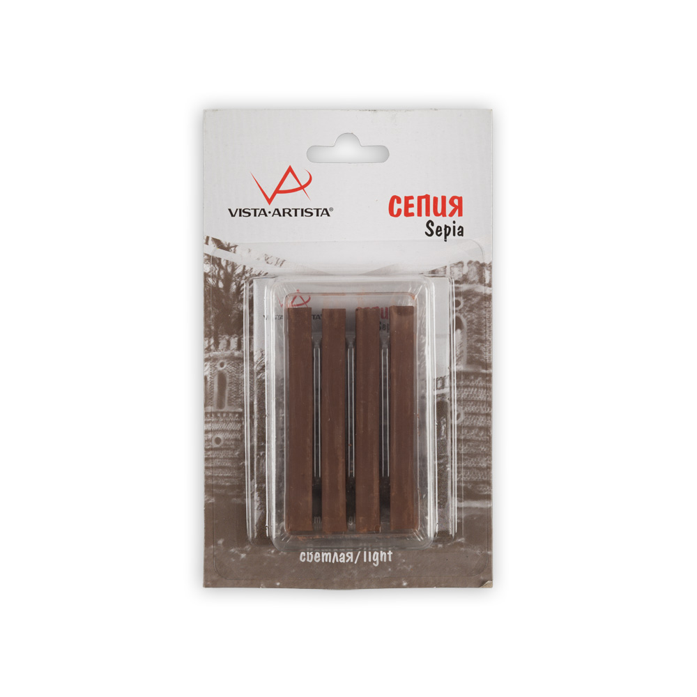 Набор сепии Vista-Artista состоит из четырех мелков прямоугольной формы. Для их производства используются высококачественные материалы, благодаря чему мелки Vista-Artista легко растушевывается, имеют нежный бархатистый оттенок и глубокий насыщенный цвет. А прямоугольная форма позволяет наносить ее тонкими, четкими штрихами. Для сохранения красочного слоя рисунка по окончанию работ рекомендуем использовать фиксатив либо листы гладкой кальки.