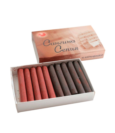 Набор включает в себя: 5 карандашей сангины, в состав которой входят специальные железо-окисные пигменты и природная глина, 5 карандашей сепии, выпускаемой на основе знаменитой глины из Часов-Яра. Упаковка: картонная коробка.