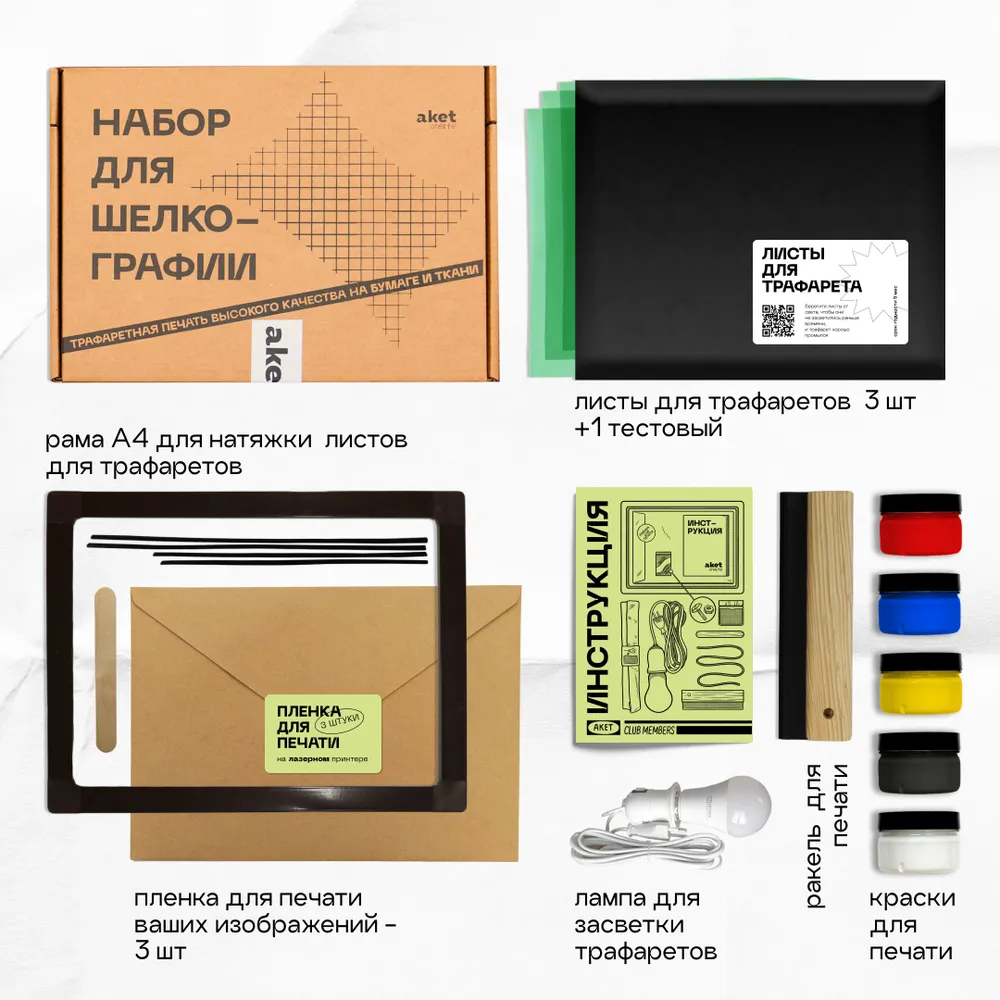 В этом наборе уже есть всё для печати в технике шелкографии, — вам нужно просто распечатать ваше изображение на принтере на плёнке из набора, установить лампу на коробку и засветить ваше изображение на готовых листах для трафарета. В наборе есть инструкция, которая подробно описывает процесс. Листы для трафарета можно докупить отдельно, когда вы захотите сделать новые трафареты. В наборе: рама многоразовая размера M (печатная площадь 18 х 27 см); листы для трафарета, которые натягиваются на раму (сетка с нанесённой эмульсией) - 3 шт + 1 тестовый лист; резиновый шнур для натяжки листов на раму; водная экологичная краска - 100 г каждого цвета (можно печатать на одежде и стирать в машинке); ракель (резиновый шпатель для печати); плёнка для печати - 3 шт; лопатка для краски, лопатка для натяжки сетки; инструкция по использованию; коробка, которая превращается в засветочную камеру; лампа для засветки, которую нужно просто установить на коробку и вставить в розетку; крепления для коробки. Срок годности листов с эмульсией — 5 месяцев (дата производства указана на конверте с листами). Уже засвеченные листы (готовые трафареты) имеют неограниченный срок хранения. Жёлтая, красная и синяя краски имею в основе прозрачную базу. Они хорошо ложатся на светлые поверхности, но на тёмных поверхностях краска едва заметна. Чтобы цвет был ярким на темной поверхности, добавьте к цветной краске белый цвет — она станет более плотной и кроющей. Или сначала напечатайте белую подложку для рисунка, а потом — цветное изображение.