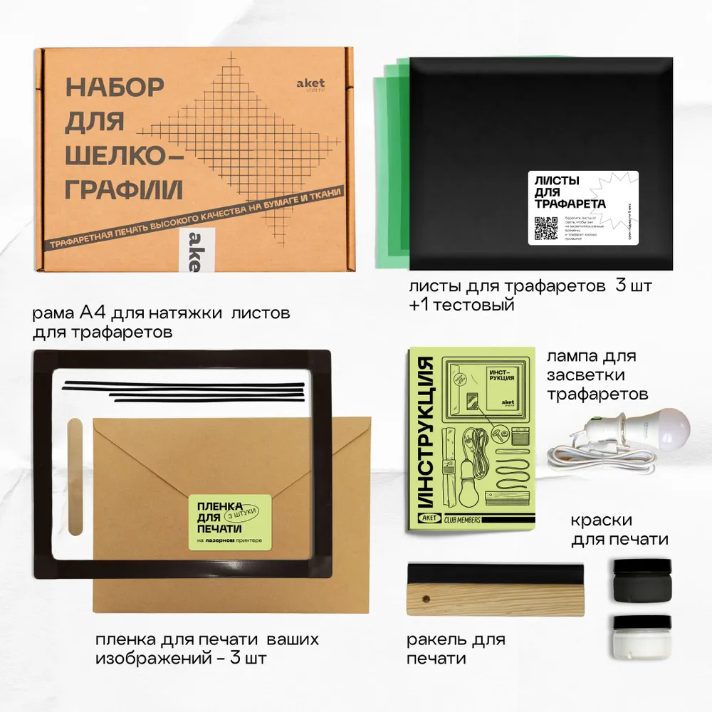 В этом наборе уже есть всё для печати в технике шелкографии, — вам нужно просто распечатать ваше изображение на принтере на плёнке из набора, установить лампу на коробку и засветить ваше изображение на готовых листах для трафарета. В наборе есть инструкция, которая подробно описывает процесс. Листы для трафарета можно докупить отдельно, когда вы захотите сделать новые трафареты. В наборе: рама многоразовая размера M (печатная площадь 18 х 27 см); листы для трафарета, которые натягиваются на раму (сетка с нанесенной эмульсией) - 3 шт + 1 тестовый лист; резиновый шнур для натяжки листов на раму; водная экологичная краска - 100 г черного и белого цвета (можно печатать на одежде и стирать в машинке); ракель (резиновый шпатель для печати); пленка для печати на лазерном принере - 3 шт; лопатка для краски, лопатка для натяжки сетки; инструкция по использованию; коробка, которая превращается в засветочную камеру; лампа для для засветки, которую нужно просто установить на коробку и вставить в розетку; крепления для коробки. Срок годности листов с эмульсией — 5 месяцев (дата производства указана на конверте с листами). Уже засвеченные листы (готовые трафареты) имеют неограниченный срок хранения.