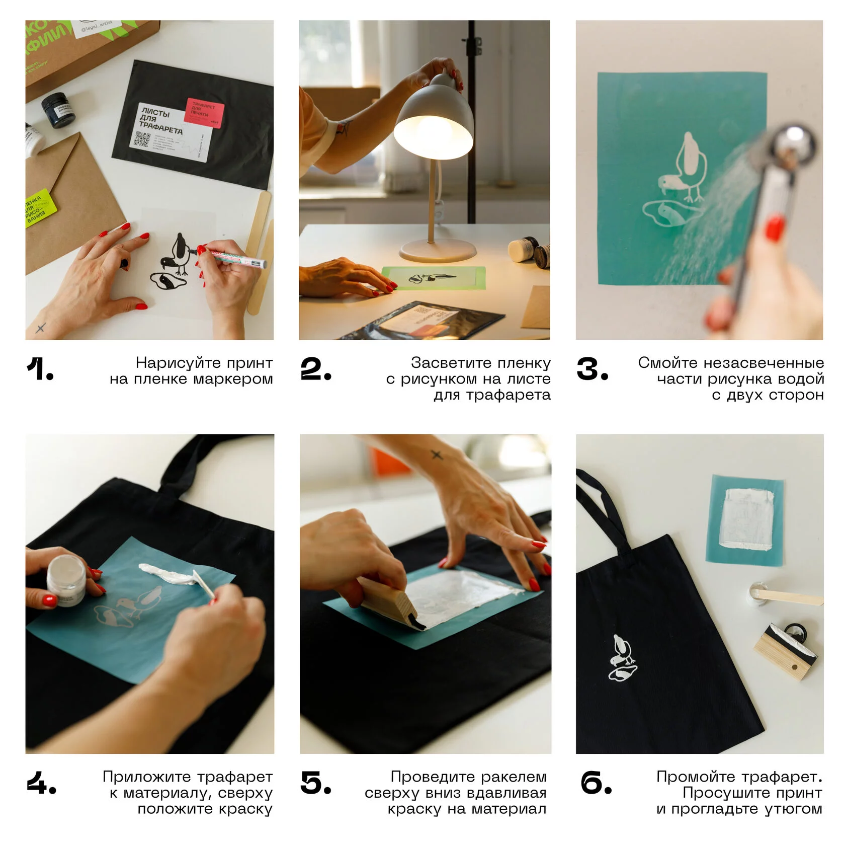Листы уже готовы для засвечивания вашего трафарета. Положите на лист фотовывод, напечатанный или нарисованный на пленке, и включите свет. После завершения засвечивания промойте лист душем и просушите его. Трафарет готов! Срок годности листов для трафарета — 5 месяцев (дата производства указана на конверте с листами). Уже засвеченные листы (готовые трафареты) имеют неограниченный срок хранения.