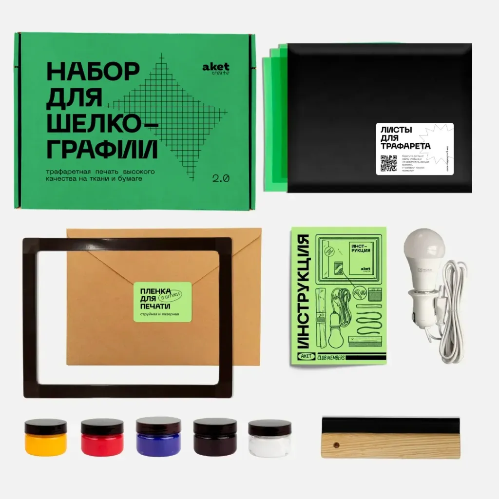 Печатная студия в коробке — полноценный комплект для старта в шелкографии дома. В наборе 5 цветов водных красок, которые можно смешивать для получения новый оттенков, и два вида пленки (для струйного и для лазерного принтера) для печати идеального фотовывода. Мы позаботились о вашем времени: вам нужно просто распечатать ваше изображение на принтере на пленке из набора, установить лампу на коробку и засветить ваше изображение на готовых листах для трафарета. В наборе есть инструкция, которая подробно описывает процесс. Требования к изображению черное изображение на белом или прозрачном фоне без переходов цвета и теней линии и точки не тоньше 1 мм Перевести изображение в битовый формат можно тут: halftonemaker.com Листы для трафарета можно купить отдельно, когда вы захотите сделать новые трафареты. В наборе: -рама многоразовая размера M (печатная площадь 18 х 27 см) -листы для трафарета, которые натягиваются на раму (сетка с нанесенной эмульсией) - 3 шт + 1 тестовый лист -резиновый шнур для натяжки листов на раму -водная краска 5 цветов - 100 г каждого цвета (можно печатать на одежде и стирать в машинке) -ракель (резиновый шпатель для печати) -пленка для печати на лазерном принтере - 3 шт -пленка для печати на струйном принтере - 3 шт -лопатка для краски, лопатка для натяжки сетки -инструкция по использованию -коробка, которая превращается в засветочную камеру -лампа для засветки, которую нужно просто установить на коробку и вставить в розетку -крепления для коробки Срок годности листов с эмульсией — 5 месяцев (дата производства указана на конверте с листами). Уже засвеченные листы (готовые трафареты) имеют неограниченный срок хранения. Желтая, красная и синяя краски имею в основе прозрачную базу. Они хорошо ложатся на светлые поверхности, но на темных поверхностях краска едва заметна. Чтобы цвет был ярким на темной поверхности, добавьте к цветной краске белый цвет — она станет более плотной и кроющей. Или сначала напечатайте белую подложку для рисунка, а потом — цветное изображение.