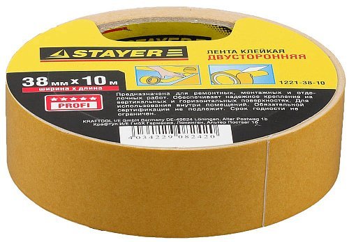 Лента STAYER "PROFI", двухсторонняя, клейкая, 38 мм х 10 м. Изготовлена из прозрачного полипропилена, клеевой слой которой, состоит из синтетического каучука и нанесен с двух сторон. Применяется при температуре, до +60°С. Предназначается для фиксации табличек, крепления напольных покрытий, элементов из картона и бумаги, а также резины, пластика и других материалов. Используются, как в быту, так и на производстве.
