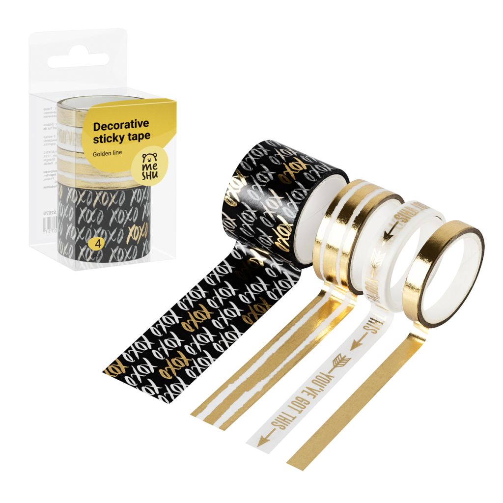Декоративные клейкие ленты MESHU предназначены для упаковки подарков, оформления поделок, элементов интерьера и скрапбукинга. Открытки, альбомы, ежедневники, подставки, цветочные горшки, подсвечники, рамки и много другое может преобразиться с декоративными лентами MESHU. Яркие и современные дизайны сделают процесс творчества увлекательным, а результат впечатляющим. А качественная клеевая основа позволит надёжно зафиксировать ленту и быть уверенным в долговечности декора. Характеристики; • Ширина ленты: 30 мм, 15мм, 10 мм, 7мм; • Длина намотки: 3000 мм; • Материал: бумага; • Количество в наборе: 4.