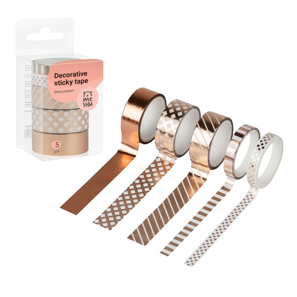 Декоративные клейкие ленты MESHU предназначены для упаковки подарков, оформления поделок, элементов интерьера и скрапбукинга. Открытки, альбомы, ежедневники, подставки, цветочные горшки, подсвечники, рамки и много другое может преобразиться с декоративными лентами MESHU. Яркие и современные дизайны сделают процесс творчества увлекательным, а результат впечатляющим. А качественная клеевая основа позволит надёжно зафиксировать ленту и быть уверенным в долговечности декора. Характеристики: • Ширина ленты: 15мм, 7мм; • Длина намотки: 3000 мм; • Материал: бумага; • Количество в наборе: 5.