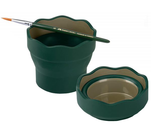 Стаканчик большого размера, около 200-250мл, но в сложенном виде почти не займет места в портфеле школьника или кармане художника. Легко складывается и раскладывается. Кисточки удобно держатся в волнообразных краях. Изготовлен из специальной резины в сочетании с пластиком и складывается за счет резиновой вставки. Устойчивый, прочный, долговечный. Цвет: зеленый.