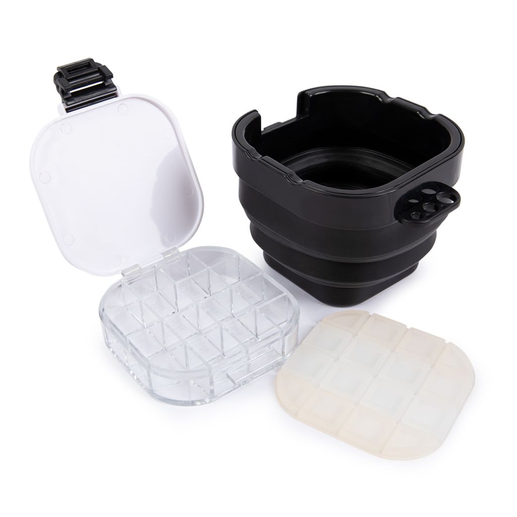 Стакан-трансформер с палитрой предназначен для выполнения художественных работ с красками. Имеет складную емкость для воды и герметичную палитру с 16 ячейками. Удобен для пленэров и выездных мероприятий. Практичен и компактен при хранении.