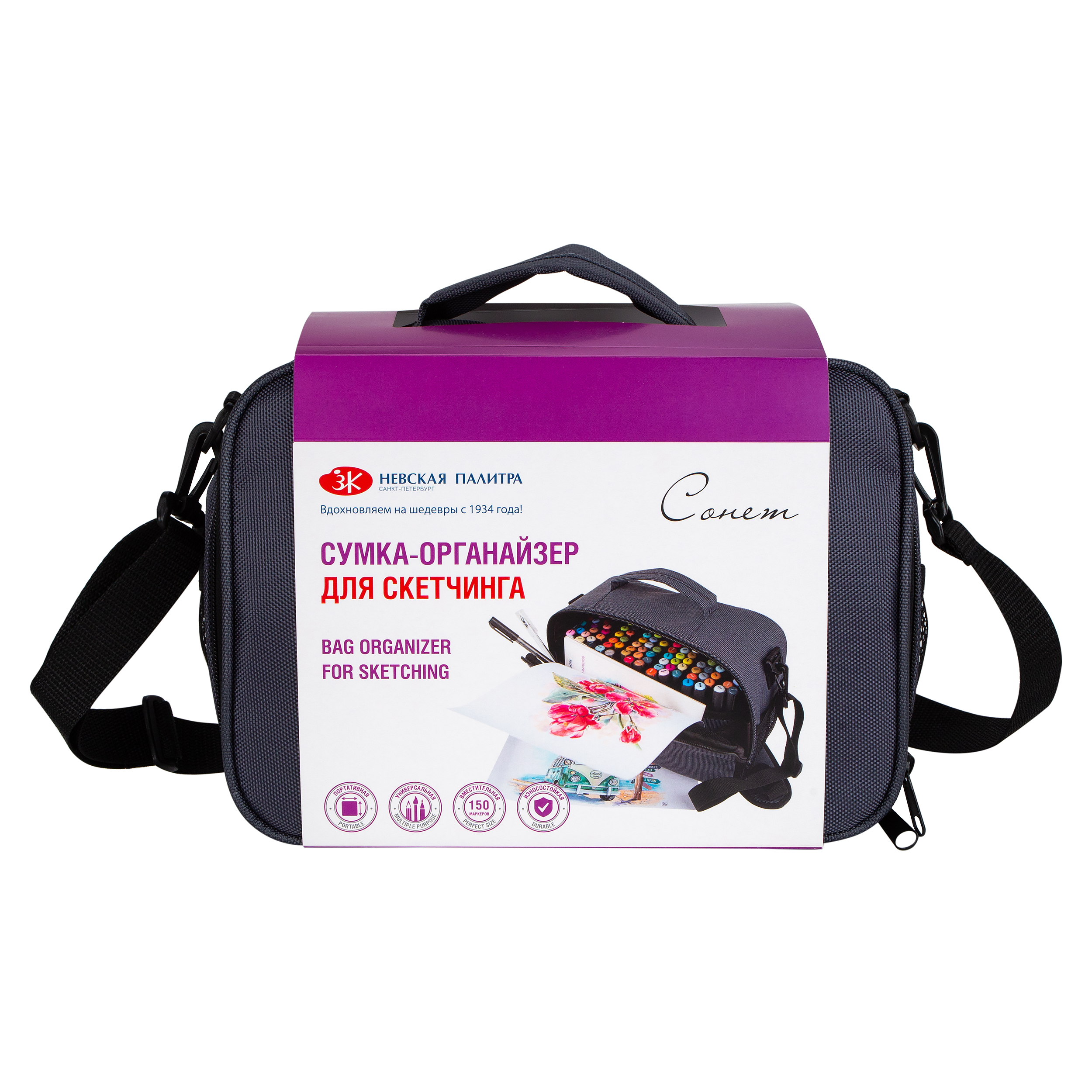 Сумка для скетчинга «Сонет» выполнена из износоустойчивого полиэстера. Размеры 30х22х13 см. обеспечивают высокую вместительность, вы с легкостью можете взять с собой актуальную палитру фломастеров и все необходимые для работы инструменты и материалы. В сумке предусмотрено несколько отделений и карманов — одно широкое отделение на молнии, 21 кармана из сетки, задний накладной карман. Внутри на передней стенке карман из сетки на молнии, на задней стенке - органайзер из резинки. Внутри сумки вкладыш-органайзер из 6-сти отделений, крепится к сумке на липучке велькро. Сумка вмещает до 150 маркеров. Одна короткая ручка для ношения в руке. Регулируемый ремень для ношения на плече.