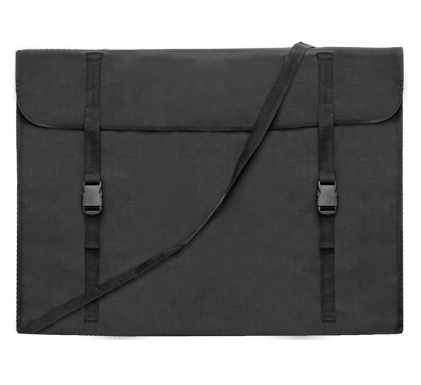 Сумка для планшета изготавливается из полиэстера (это особый вид синтетической ткани, по внешнему виду напоминающей хлопок). Такой материал хорошо сохраняет форму и не нуждается в специальном уходе, к тому же сумка хорошо отстирывается. Формат сумки 60*78*8 сантиметров. Такой размер выбран специально для того, чтобы в сумку можно было положить планшет формата 55*75, бумагу и дополнительные материалы. Сумка закрывается на две пластиковые клипсы. Для удобства переноски предусмотрен наплечный ремень. Производится компанией Эстадо в городе Воронеже.