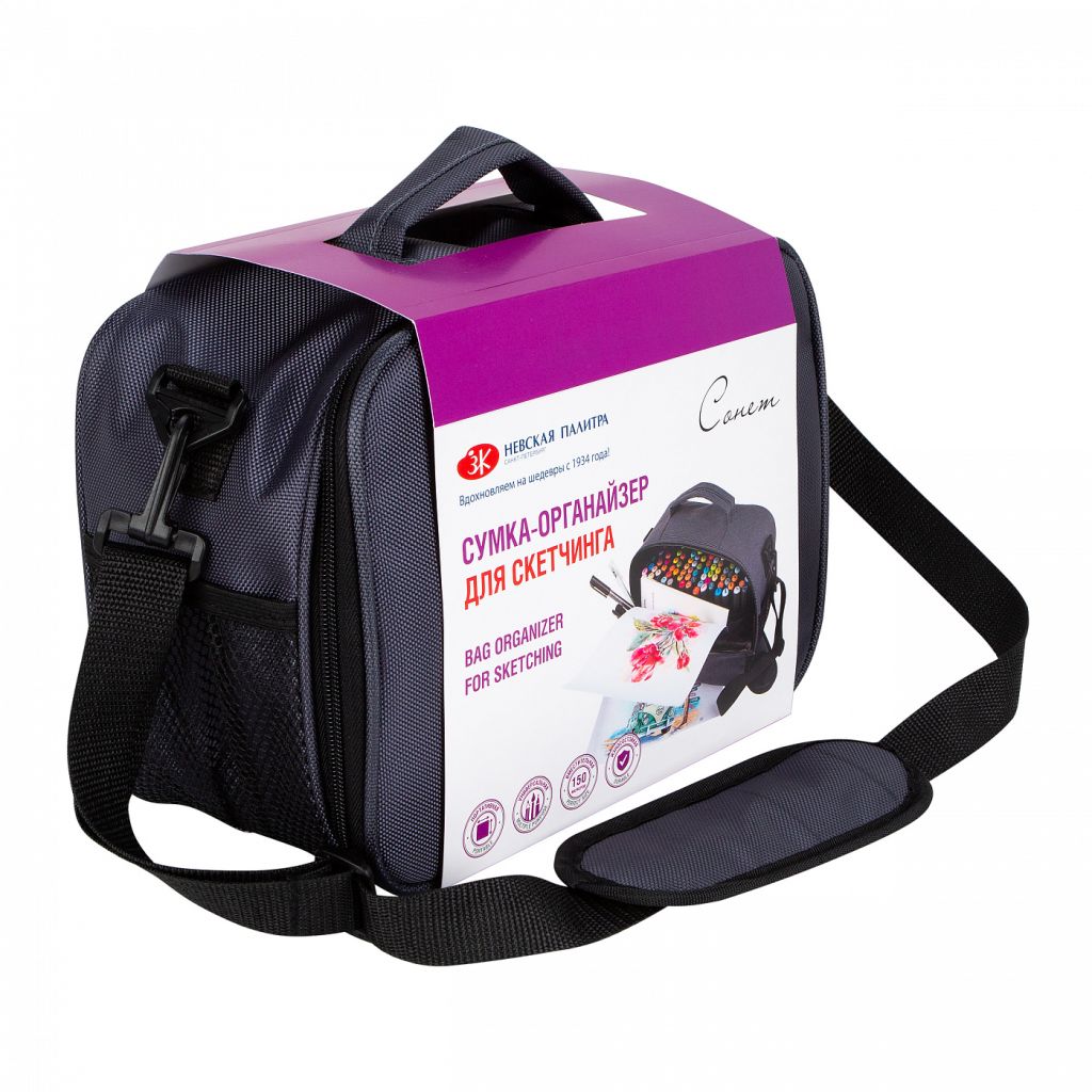 Сумка для скетчинга «Сонет» выполнена из износоустойчивого полиэстера. Размеры 30х22х13 см. обеспечивают высокую вместительность, вы с легкостью можете взять с собой актуальную палитру фломастеров и все необходимые для работы инструменты и материалы. В сумке предусмотрено несколько отделений и карманов — одно широкое отделение на молнии, 21 кармана из сетки, задний накладной карман. Внутри на передней стенке карман из сетки на молнии, на задней стенке - органайзер из резинки. Внутри сумки вкладыш-органайзер из 6-сти отделений, крепится к сумке на липучке велькро. Сумка вмещает до 150 маркеров. Одна короткая ручка для ношения в руке. Регулируемый ремень для ношения на плече.