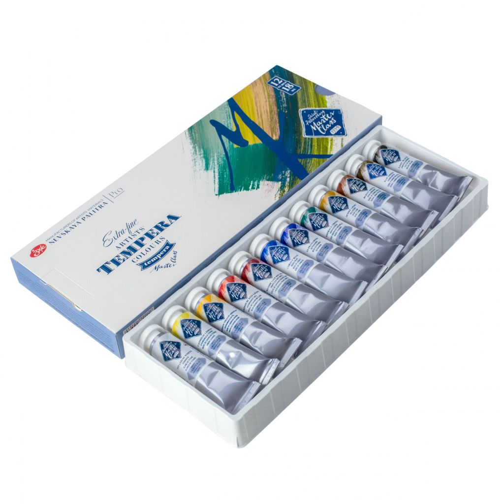 Художественные темперные поливинилацетатные краски «Мастер-Класс» изготавливаются на основе органических и неорганических пигментов и поливинилацетатной дисперсии и являются традиционным материалом для живописи. Благодаря тщательно подобранным компонентам темперные краски прекрасно подходят для живописных и декоративно-оформительских работ. Большинство цветов в палитре монопигментные и обладают высочайшим показателем светостойкости. Все краски выкопигментированные, яркие и чистые. Темпера «Мастер-Класс» позволяет получить многообразие благородных оттенков в разбелах и смесях. Краски легко наносятся на бумагу, картон, дерево, керамику, грунтованный и негрунтованный холст. При высыхании образуют эластичную, непрозрачную, несмываемую пленку. Сбалансированная палитра из 12 цветов в наборе «Мастер-Класс» позволяет решить множество творческих задач художника. Температура транспортирования/хранения: не ниже 0 °С/не ниже 0 °С. Гарантийный срок - 4 года с даты изготовления набора. Состав набора: Белила титановые, Кадмий лимонный, Кадмий желтый средний, Кадмий красный светлый, Краплак красный (А), Кобальт синий, Ультрамарин, Изумрудно-зеленая, Охра светлая, Сиена жженая, Умбра натуральная, Сажа газовая.