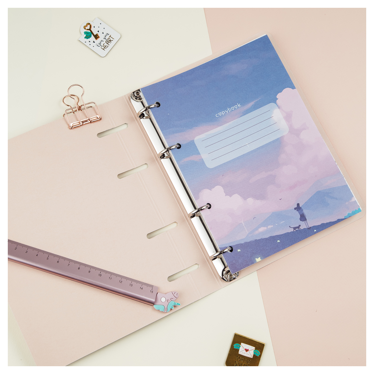 Тетрадь на кольцах удобна для большого объема записей. Легко вынимать и вставлять дополнительные листы. Блок - 100 листов из белой офсетной бумаги 65 гр/м2., белизной 100%. Линовка - клетка. Обложка тетради из плотного картона выделяется ярким дизайном и цветной запечаткой форзаца. Отделка обложки - матовая ламинация и тиснение фольгой