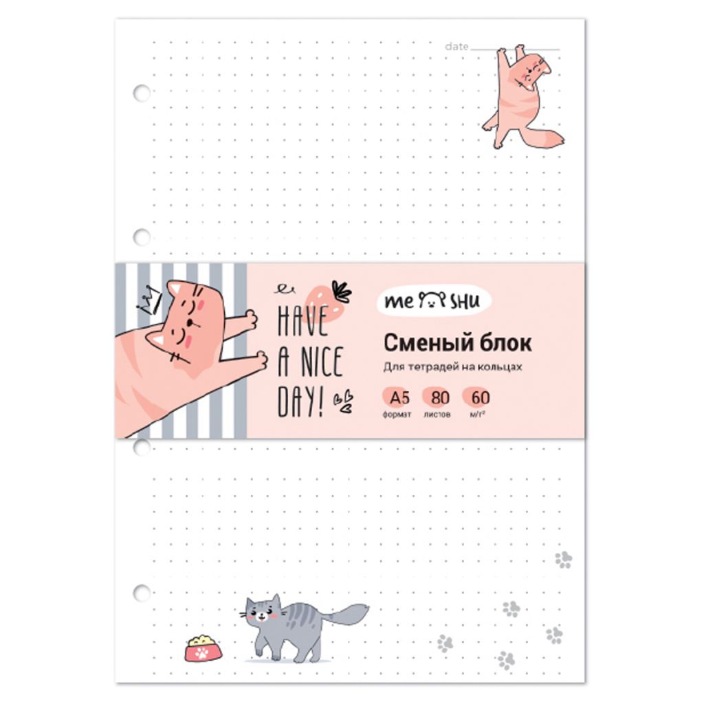 Сменный блок для тетрадей с кольцевыми механизмами. Формат А5, 80 листов. Офсетная бумага плотность 60 г/м? в точку, с дизайнерским блоком. Листы скреплены стрип-лентой и так же упакованы в т/у пленку. Цветной дизайн блока и линовка в точку поднимет настроение, и ваша тетрадь станет незаменимым помощником в повседневных делах.