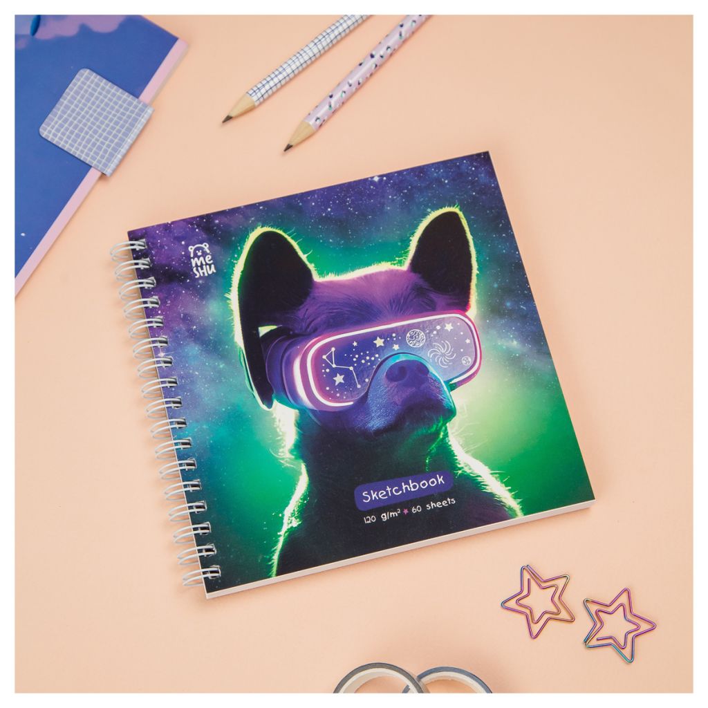 Скетчбук MESHU «Виртуальный мир» оценят любители творчества. Изделие размером 150*150 мм подойдёт для рисования цветными и акварельными карандашами, а также другими графическими материалами. Внутренний блок — 60 белых листов из офсетной бумаги плотностью 120 г/м2. Благодаря компактному формату скетчбук удобно брать в путешествие, на прогулку или пленэр. Переплёт на гребне позволяет раскрывать изделие на 360 градусов. Скетчбук легко перелистывать и открывать в нужном месте. Изделие превращается в планшет — формат, который подходит для рисования на коленке. В обложке используются приятное на ощупь покрытие soft-touch и выборочный лак. Скетчбук с изображением домашнего любимца в стиле киберпанк поможет найти вдохновение. • Размер: 150*150 мм; • Количество листов: 60; • Тип скрепления: гребень/спираль; • Внутренний блок: офсетная бумага; • Плотность блока: 120 г/м2.