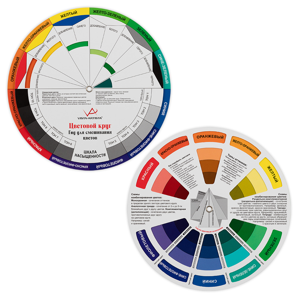 Цветовой круг является основой, на которой строится вся современная теория и практика колористики. Такой инструмет необходим тем, чья деятельность связана с выбором и подбором цвета. Это дизайнеры, проектировщики, художники, портные, фотографы, мастера визажа, маникюра, студенты творческих вузов и т.д. Благодаря своей универсальности, этот инструмент доступен и новичкам, для бытовых и любых других целей. Цветовой круг позволяет правильно обустроить жилище и сделать красивый ремонт, создать свой стиль одежды и удачно подбирать соответствующие друг другу аксессуары. Это идеальная шпаргалка для всех, кто хочет научиться гармонии цвета и жизни! Цветовой круг имеет две стороны: одна сторона предназначена для подбора цветовых сочетаний, другая - для определения цвета, получаемого путём смешения цветов.
