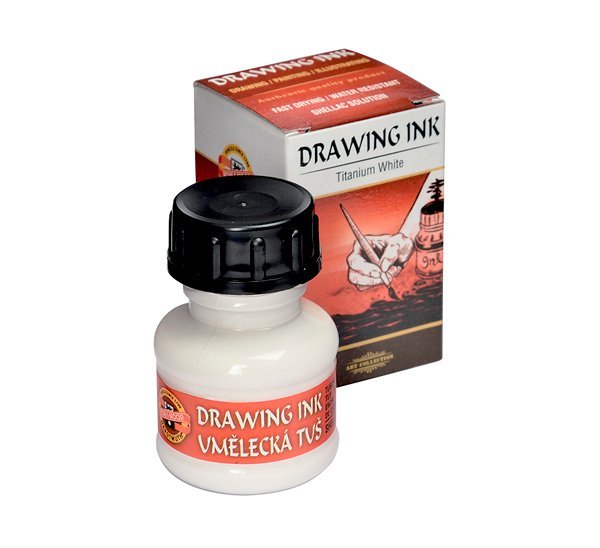 KOH-I-NOOR HARDTMUTH – самый известный чешский производитель принадлежностей для рисования, канцелярских товаров и товаров для творчества. Компания получила название в честь алмаза «Кохинор» и была основана в 1790 году. Тушь на шеллачной основе, выпускаемая компанией KOH-I-NOOR («Кохин?р»), содержит качественные мелко тертые пигменты. Тушь предназначена для любительского и профессионального использования. Широко применяется в графических, художественных работах, каллиграфии и черчении. Обладает глубоким, ярким, насыщенным цветом и блеском. Перед использованием тушь рекомендуется хорошо взболтать. Благодаря своей структуре она хорошо наносится на различные виды бумаги и картона. Для нанесения рекомендуется использовать перо или кисть. После высыхания тушь образует влагостойкую пленку. Для заправки в рапидографы и изографы не подходит. Тушь на шеллачной основе выпускается в баночках по 20 миллилитров, которые упакованы в картонную коробку. представлено 14 разнообразных цветов, среди которых золотой и серебряный.