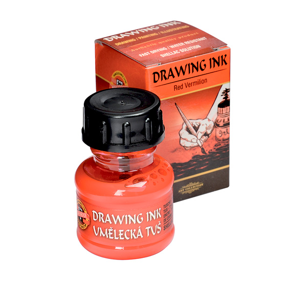 KOH-I-NOOR HARDTMUTH – самый известный чешский производитель принадлежностей для рисования, канцелярских товаров и товаров для творчества. Компания получила название в честь алмаза «Кохинор» и была основана в 1790 году. Тушь на шеллачной основе, выпускаемая компанией KOH-I-NOOR («Кохин?р»), содержит качественные мелко тертые пигменты. Тушь предназначена для любительского и профессионального использования. Широко применяется в графических, художественных работах, каллиграфии и черчении. Обладает глубоким, ярким, насыщенным цветом и блеском. Перед использованием тушь рекомендуется хорошо взболтать. Благодаря своей структуре она хорошо наносится на различные виды бумаги и картона. Для нанесения рекомендуется использовать перо или кисть. После высыхания тушь образует влагостойкую пленку. Для заправки в рапидографы и изографы не подходит. Тушь на шеллачной основе выпускается в баночках по 20 миллилитров, которые упакованы в картонную коробку. представлено 14 разнообразных цветов, среди которых золотой и серебряный.