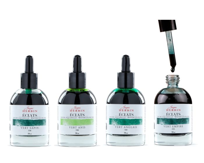 Новая линейка акварельных чернил для художников от старейшего французского бренда J.Herbin — яркие, прозрачные, насыщенные цвета. Чернила легко распределяются как по сухой, так и по влажной бумаге. Их можно смешивать между собой и использовать как в концентрированном, так и в разбавленном видах, создавая множество оттенков – от супер ярких до лёгких пастельных. Три цвета металлик: серебро, золото, медь, а также белый – пигментированы. Эти оттенки матовые, укрывистые, и используются только в концентрированном (неразбавленном) виде. Акварельные чернила можно использовать с кистями, перьями-макалками аэрографами. Походит любая бумага для рисования, акварельная бумага и картон. Vegan Inks – это веганские чернила без использования компонентов животного происхождения. Элегантные стеклянные флаконы с пипеткой для удобного набора чернил.