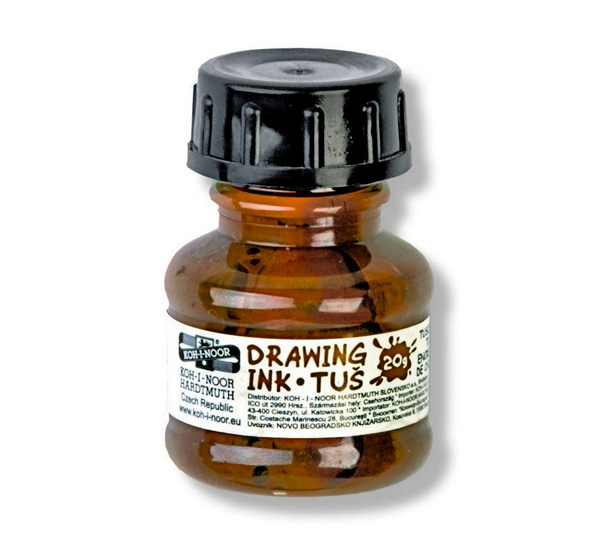 KOH-I-NOOR HARDTMUTH – самый известный чешский производитель принадлежностей для рисования, канцелярских товаров и товаров для творчества. Компания получила название в честь алмаза «Кохинор» и была основана в 1790 году. Тушь на водной основе, выпускаемая компанией KOH-I-NOOR (Кохин?р»), предназначена для любительского и профессионального использования, но для заправки в рапидографы и изографы не подходит. Широко применяется в графических, художественных работах и каллиграфии. Благодаря своей структуре тушь хорошо наносится на различные виды бумаги и картона. Для нанесения рекомендуется использовать перо или кисть. После высыхания на поверхности образуется влагостойкая пленка. Тушь на водной основе выпускается в пластиковых баночках по 20 миллилитров. представлены основные цвета: белый, черный, коричневый, желтый, красный, зеленый и синий.