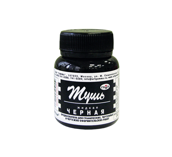 Жидкая тушь выпускается российской компанией «Гамма», которая уже более 100 лет экспериментирует с пигментами, производит художественные краски и другие товары для творчества. Жидкая тушь производства компании «Гамма» изготавливается на водной основе с использованием синтетических красителей. Используется для чертежно-графических и художественных работ. Тушь можно наносить пером или кистью, она хорошо ложится на бумагу с любой фактурой и быстро сохнет. Жидкая тушь выпускается в баночках объемом 70 миллилитров в пяти цветовых гаммах: черной, желтой, красной, зеленой, и синей.