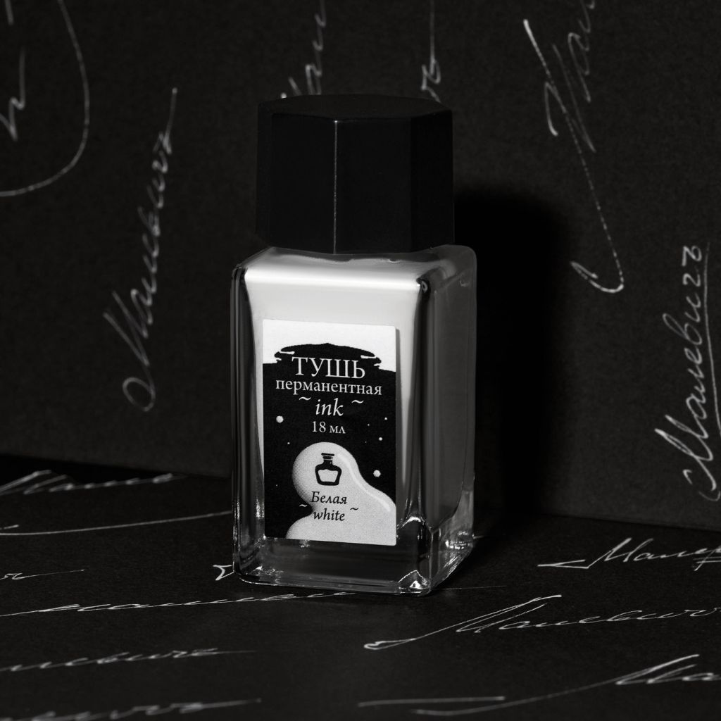 Перманентная тушь для рисования и каллиграфии от бренда «Малевичъ». Плотная, яркая быстросохнущая тушь не размывается водой после высыхания. Хорошо подойдет для любителей скетчинга. После высыхания рисунок остается четким и ярким. Можно совмещать с акварелью. Тушь «Малевичъ» не обладают высокой светостойкостью, поэтому для сохранности работ лучше использовать тушь в скетчбуках или сканировать готовые работы. Во время работы баночку следует закрывать, отливая некоторое количество чернил в чернильницу. После использования перья следует сразу тщательно очистить специальными составами, спиртом или промыть под проточной водой. После воды перья следует тщательно вытереть салфеткой и оставить просохнуть. Тушь не рекомендуется заправлять в перьевые ручки и кисти с резервуаром. Широкая палитра цветной туши «Малевичъ» даёт возможность разнообразить работы, привнести что-то новое в своё творчество. В серии представлено 17 различных цветов туши для каллиграфии и рисования. Состав: пигмент, вода, диэтиленгликоль, функциональные добавки.