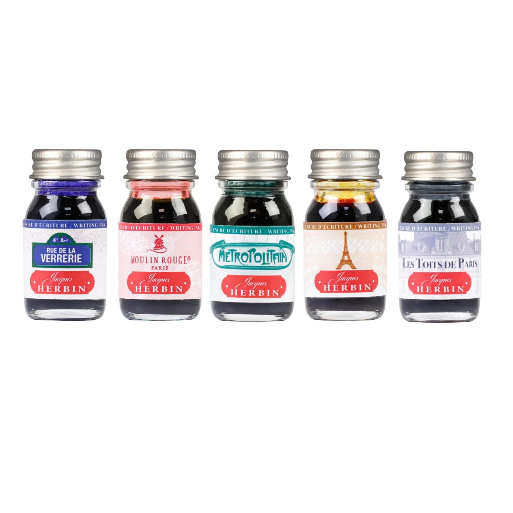 Чернила Herbin серии Paris Collection — это настоящая мини-экскурсия по улицам Парижа в 5 новых цветах, которые по праву считаются визитной карточкой французской столицы. Коричневый Tour Eiffel навеян величием Эйфилевой башни, серый Toits De Paris отражает красоту металлических крыш, синий De La Verrerie манит вывесками уличных лавок, красный Moulin Rouge открывает двери знаменитого кабаре у подножия Монмартра, а зелёный Metro Parisien унесёт вас в шумном вагоне подземки. Чернила Ph-нейтральны. Текучие и лёгкие с хорошими смазывающими свойствами чернила произведены на основе натуральных красителей, максимально бережно воздействуют на фидеры, перья и внутренние части механизма перьевой ручки. Представлены во флаконах по 30 мл.