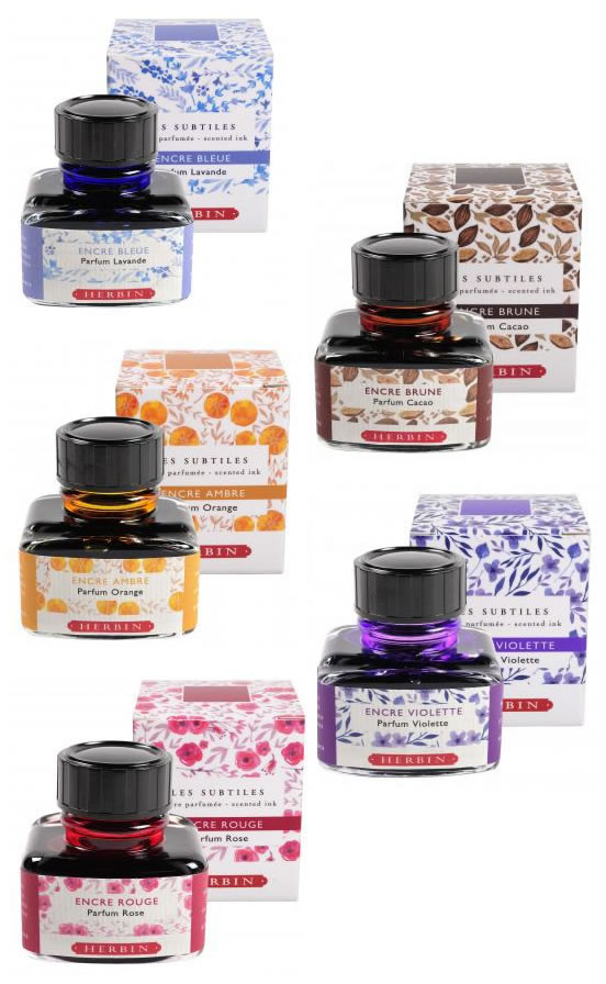Эти изысканно-романтические чернила идеально подходят для перьевых ручек, поскольку они имеют натуральный аромат и не содержат пигментов. Ароматические чернила Herbin изготавливаются из цветочной воды (гидролата) розы, апельсина, лаванды, яблока и фиалки. Гидролаты, используемые Herbin, поступают из Грасса, Франция, прованского города, давно связанного с парфюмерной промышленностью и известного своими цветочными ароматами. Каждый цвет соответствует определённому аромату: лимон, какао, роза, апельсин и фиалка.