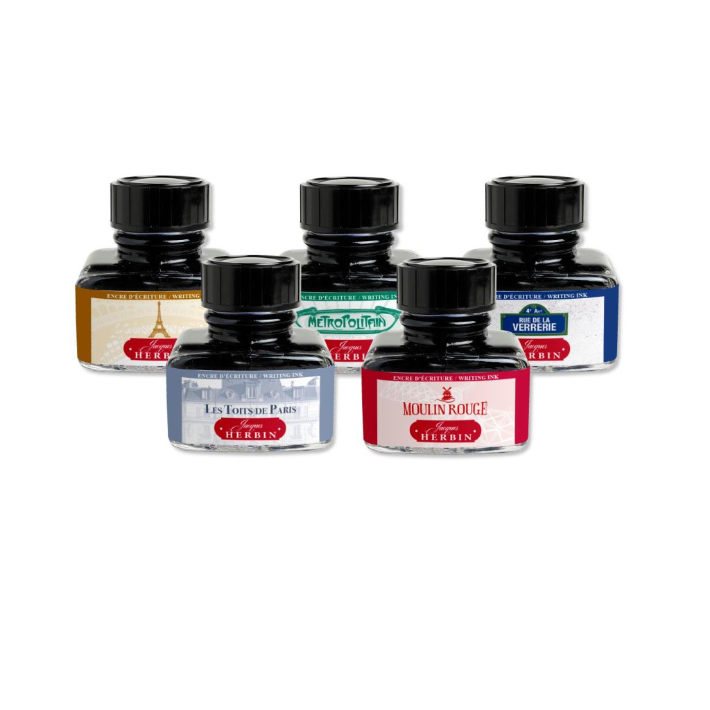Чернила Herbin серии Paris Collection — это настоящая мини-экскурсия по улицам Парижа в 5 новых цветах, которые по праву считаются визитной карточкой французской столицы. Коричневый Tour Eiffel навеян величием Эйфилевой башни, серый Toits De Paris отражает красоту металлических крыш, синий De La Verrerie манит вывесками уличных лавок, красный Moulin Rouge открывает двери знаменитого кабаре у подножия Монмартра, а зелёный Metro Parisien унесёт вас в шумном вагоне подземки. Чернила Ph-нейтральны. Текучие и лёгкие с хорошими смазывающими свойствами чернила произведены на основе натуральных красителей, максимально бережно воздействуют на фидеры, перья и внутренние части механизма перьевой ручки. Представлены во флаконах по 30 мл.