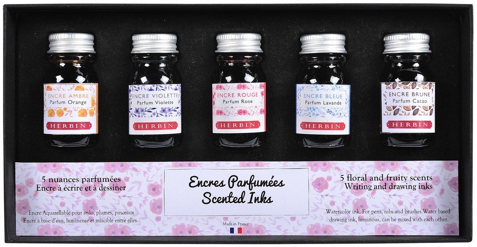 Эти изысканно-романтические чернила идеально подходят для перьевых ручек, поскольку они имеют натуральный аромат и не содержат пигментов. Ароматические чернила Herbin изготавливаются из цветочной воды (гидролата). Гидролаты, используемые Herbin, поступают из Грасса, Франция, прованского города, давно связанного с парфюмерной промышленностью и известного своими цветочными ароматами. Каждый цвет соответствует определённому аромату: апельсин, фиалка, роза, лаванда, какао.