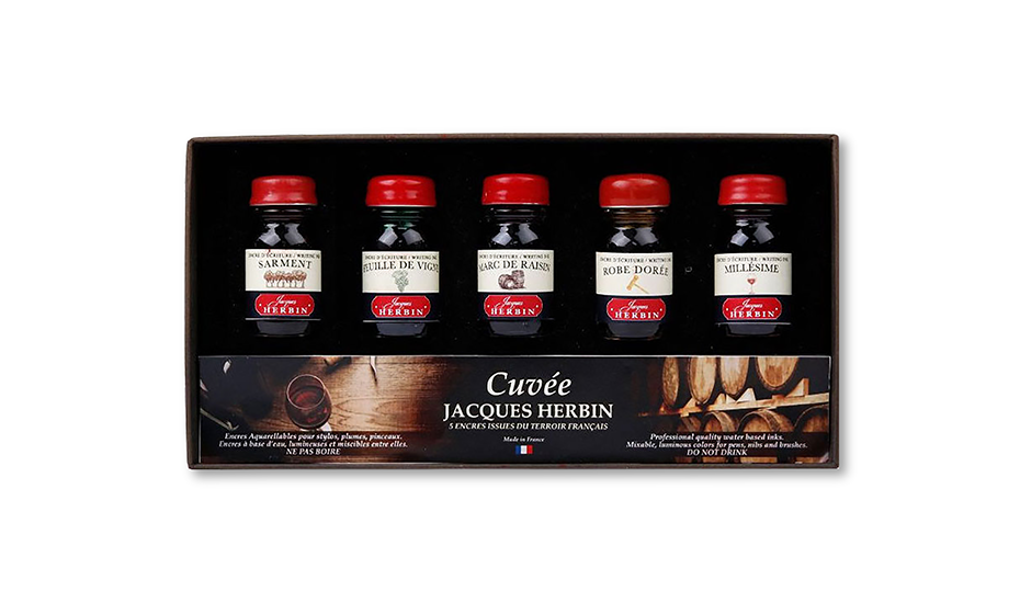 Набор из 5 чернил Jacques Herbin Cuv?e емкостью 10 мл. приглушенных цветов, посвящённых виноделию. Цвета в наборе: Sarment - коричневый цвет виноградной лозы; Feuille de vigne - зеленый цвет виноградных листьев; Marc de raisin - фиолетовый цвет выжимок винограда; Robe dor?e - богатый золотистый цвет белого вина; Mill?sime - темно-красный, цвет безупречного винтажного вина. Чернила Herbin уже давно стали любимыми у многих любителей перьевых ручек во всем мире. Помимо широкой цветовой гаммы, эти чернила особенно популярны благодаря использованию в их составе полностью натуральных красителей. Поэтому эти чернила ph-нейтральны, обеспечивают плавное письмо, быстро сохнут и подходят ко всем современным перьевым ручкам (независимо от их механизма заправки).