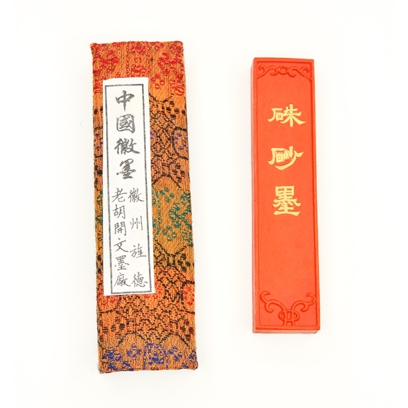 Тушь сухая в брикете ярко-оранжевого цвета. Каждый брусок оформлен оттиском иероглифов. При высыхании дает насыщенный оранжевый оттенок. Для приготовления туши используйте камень для растирки. Брусок держите вертикально к камню и растирайте с усилием в небольшом количестве воды, до появления "сухой дорожки". Не храните готовую тушь, используйте сразу после растирания.
