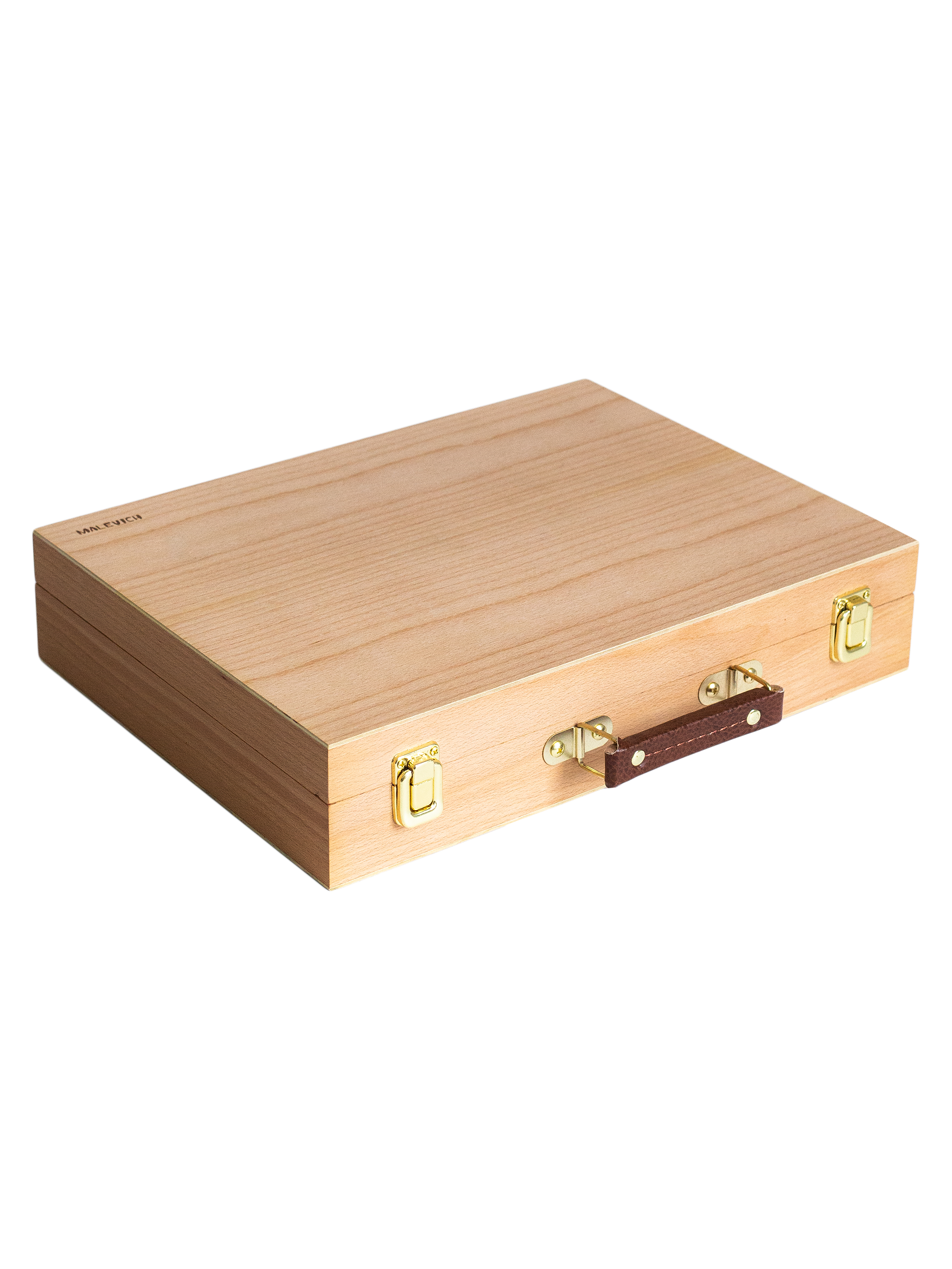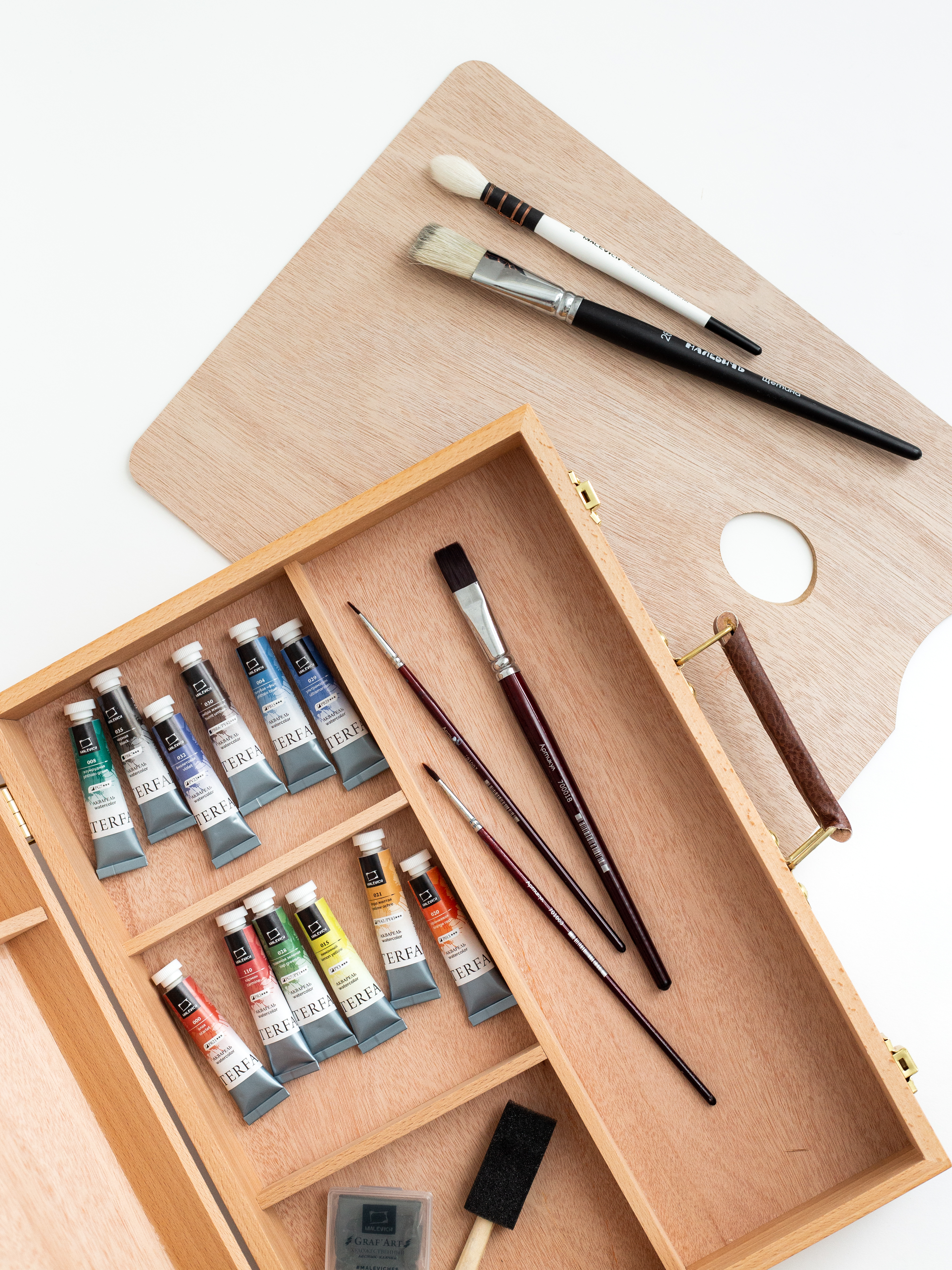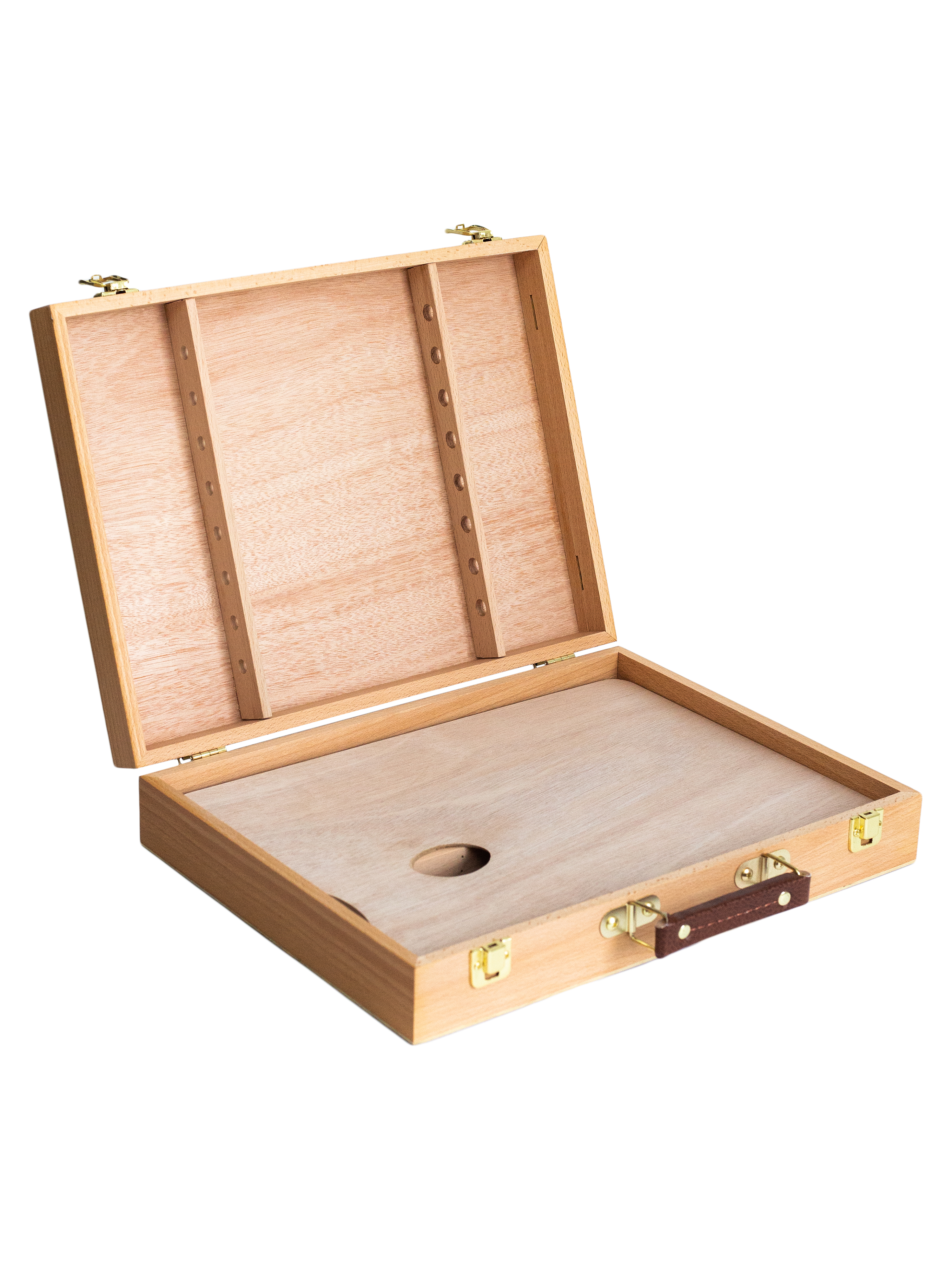 Ящик предназначен для хранения и переноски художественных принадлежностей. Имеет отделения для красок и специальные держатели для кистей. В комплект входит деревянная палитра для красок. Габариты: - В сложенном виде - 30х40х8,5 см - Палитра - 38х27,5 см (в комплекте) Внутри отверстия для кистей на длинной ручке и 4 отделения: - одно 38х12 см, - три по 15х12 см.