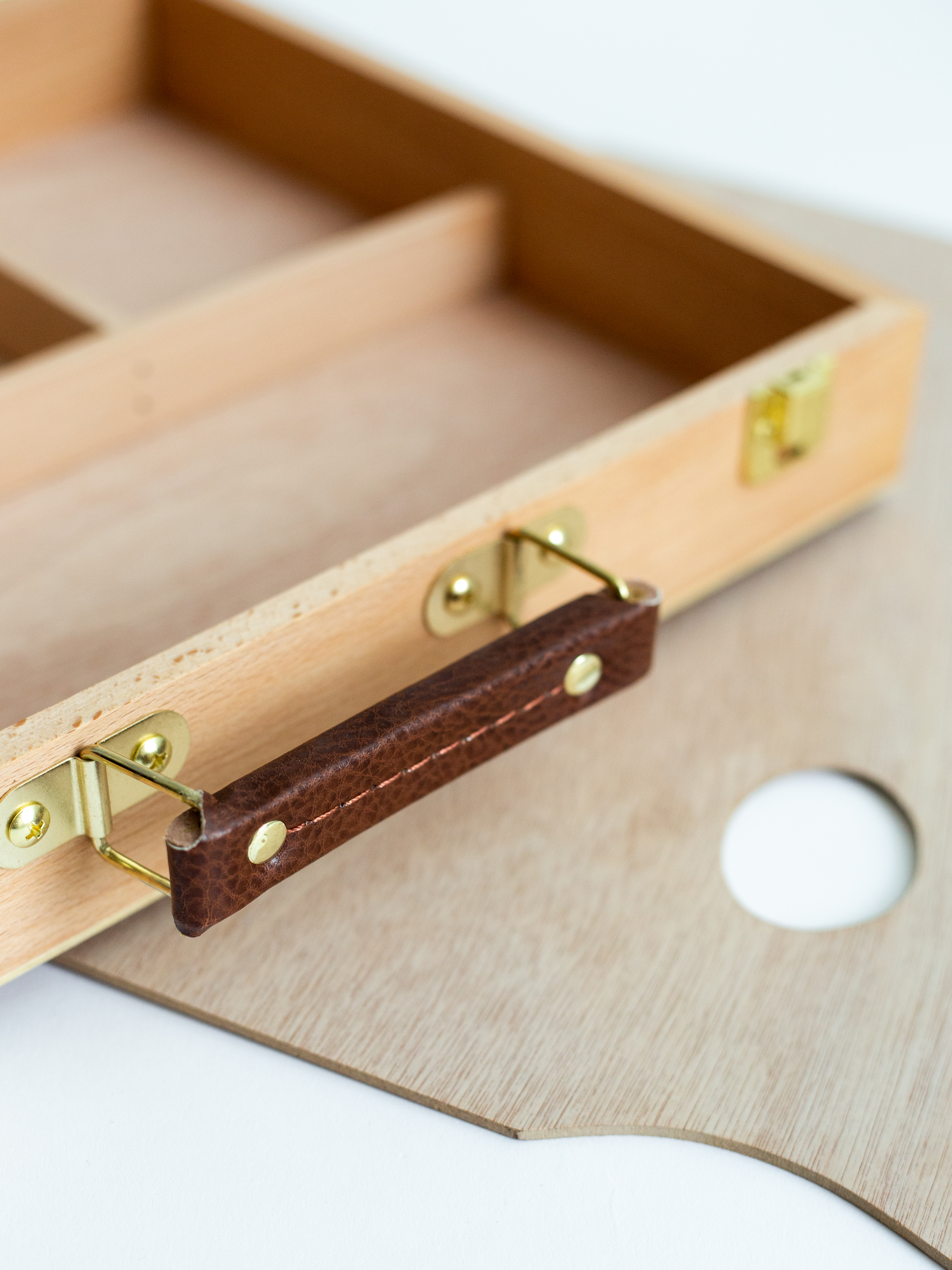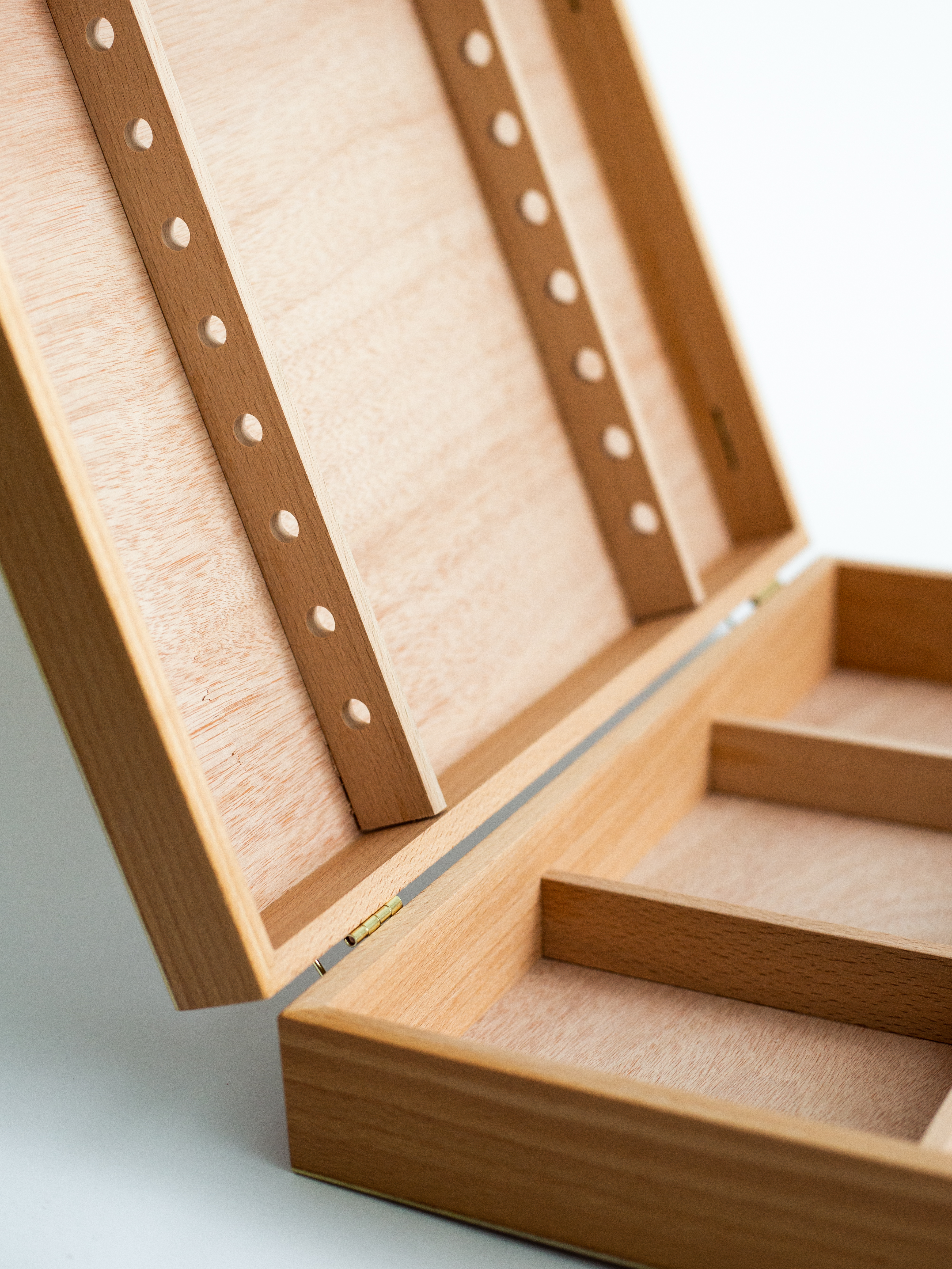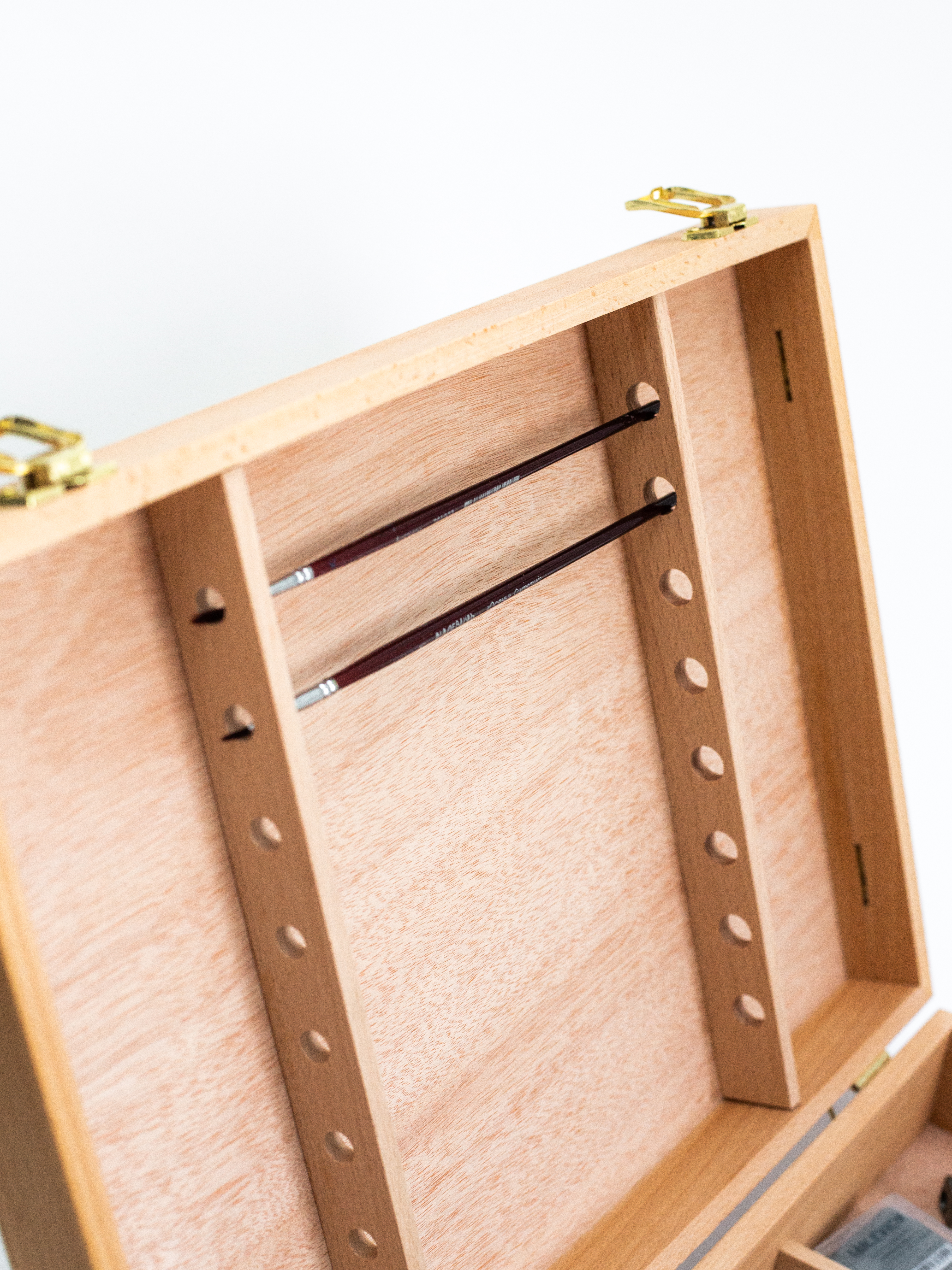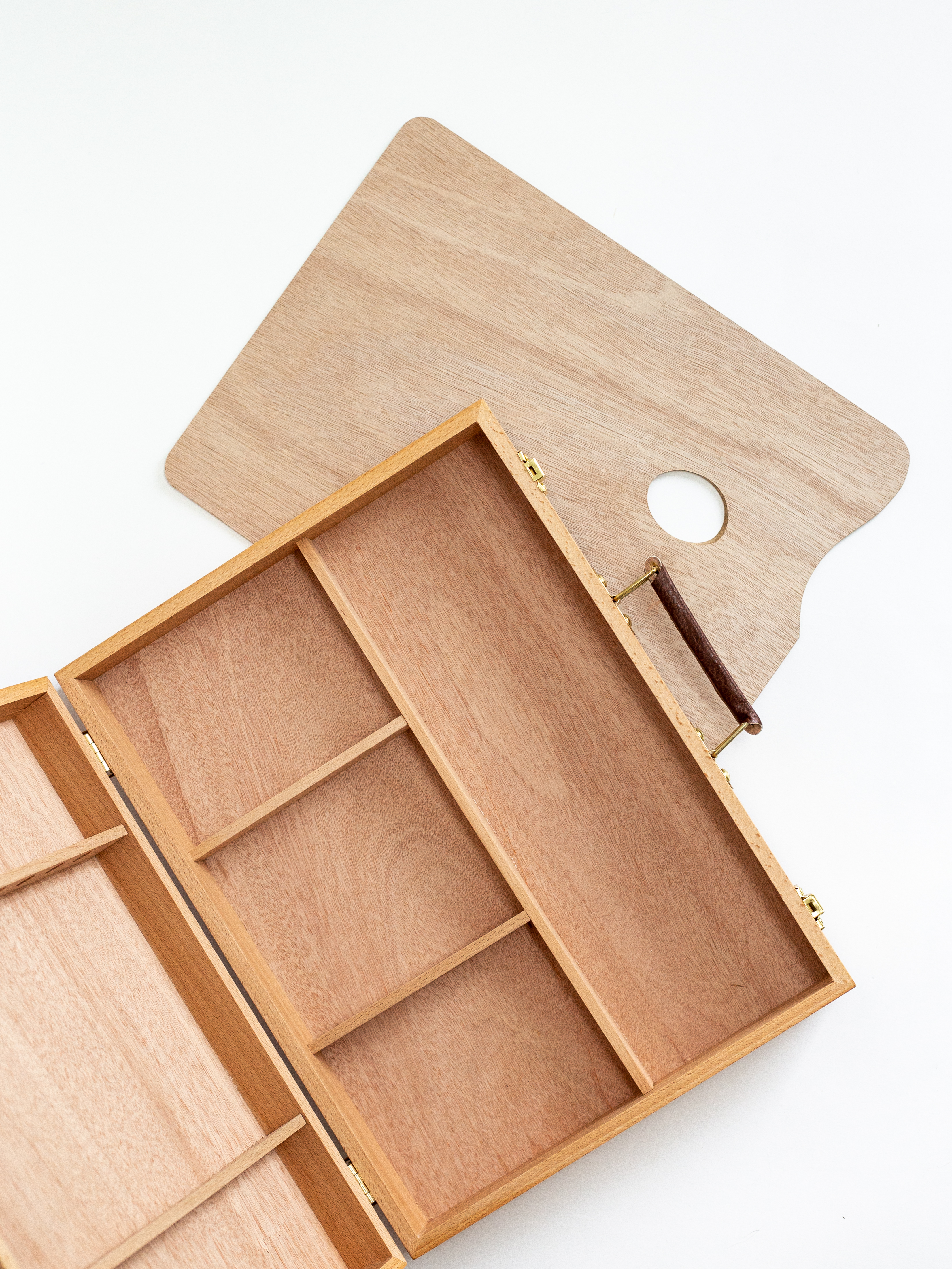 Ящик предназначен для хранения и переноски художественных принадлежностей. Имеет отделения для красок и специальные держатели для кистей. В комплект входит деревянная палитра для красок. Габариты: - В сложенном виде - 30х40х8,5 см - Палитра - 38х27,5 см (в комплекте) Внутри отверстия для кистей на длинной ручке и 4 отделения: - одно 38х12 см, - три по 15х12 см.