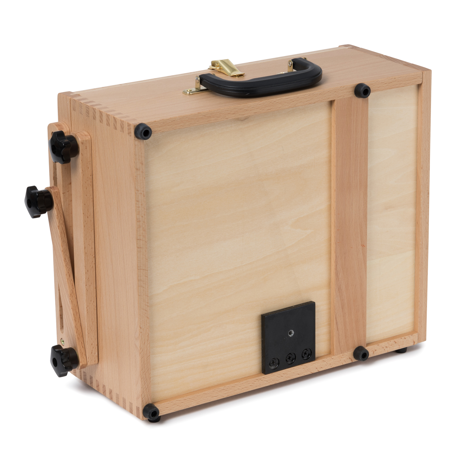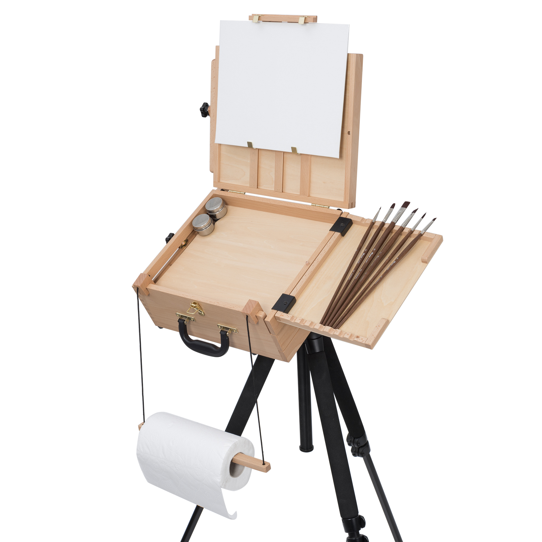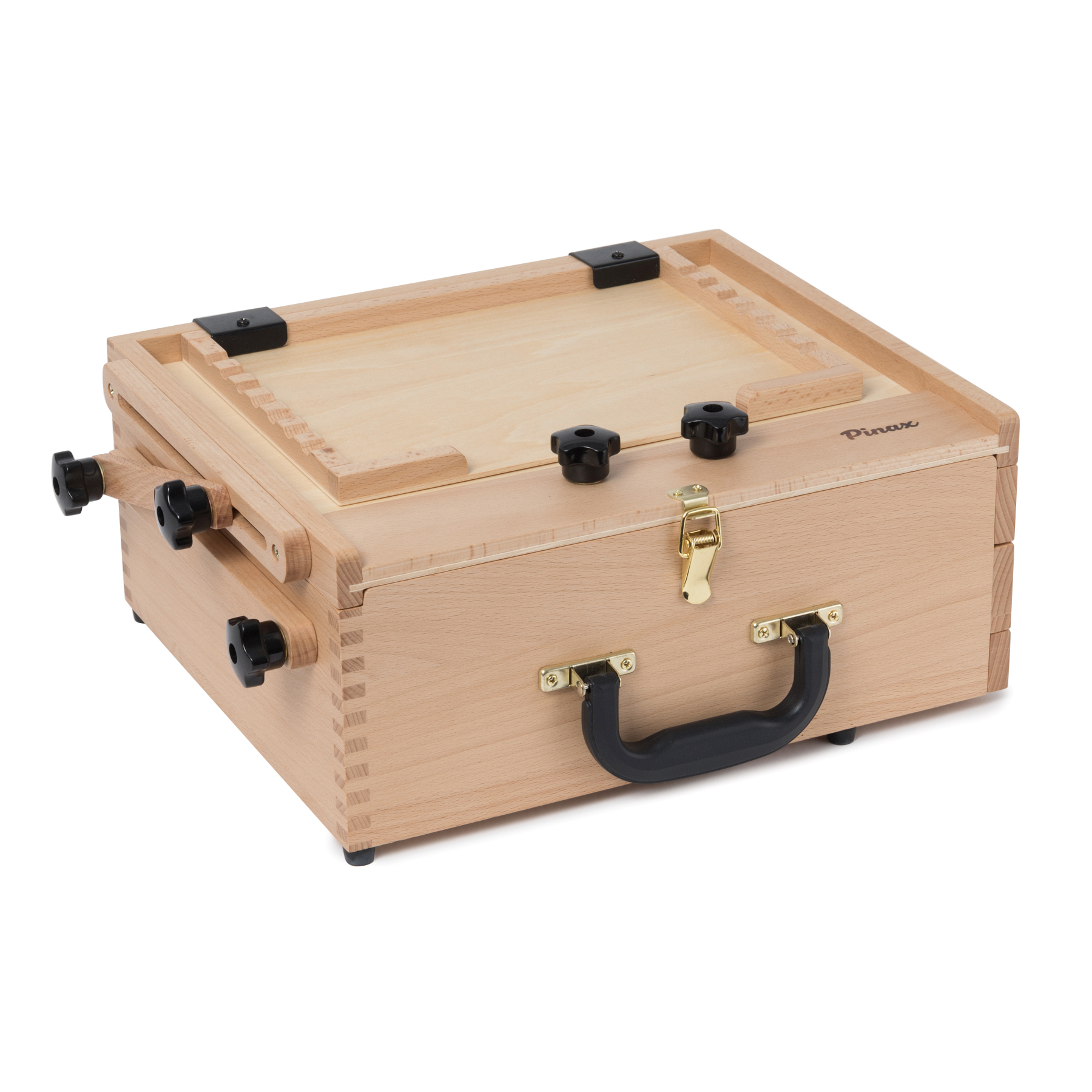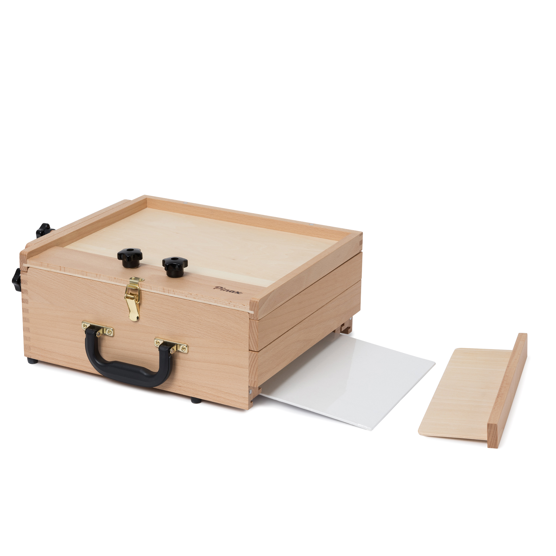 Этюдный ящик станет незаменимым помощником художника на пленэрах и в процессе работ вне студии. Конструкция этюдника предусматривает возможность установки холста максимальной высотой до 45 см., с регулировкой наклона и высоты нижней планки в широком диапазоне. Под сдвижной палитрой расположен удобный органайзер для кистей, красок и прочих принадлежностей, сбоку предусмотрен кассетник для запаса холстов на картоне, откидная полочка для кистей позволяет расположить рабочий инструмент рядом с работой, держатель для рулонного полотенца обеспечит удобство и чистоту в работе. На дне этюдника расположено штатное крепление на фотоштатив. Этюдник выполнен из бука, размеры 37,5х30х16 см. Данный товар представлен брендом Pinax. Pinax — мировой бренд товаров, который представлен на российском рынке с начала XXI века. Изначально компания производила только кисти для художественных работ, но затем расширила свое производство и не потеряв качество своей продукции начала производить холсты, мольберты и аксессуары для художников. Сейчас ассортимент включает в себя большое количество наименований. Размер основания: 33.4 ? 28 см. Диапазон высот: 41 — 60 см. Материал: промасленный бук Максимальная высота холста: 43 см. Размер упаковки 44 ? 36 ? 21 см. Вес брутто: 3.5 кг. *Товар поставляется без штатива.