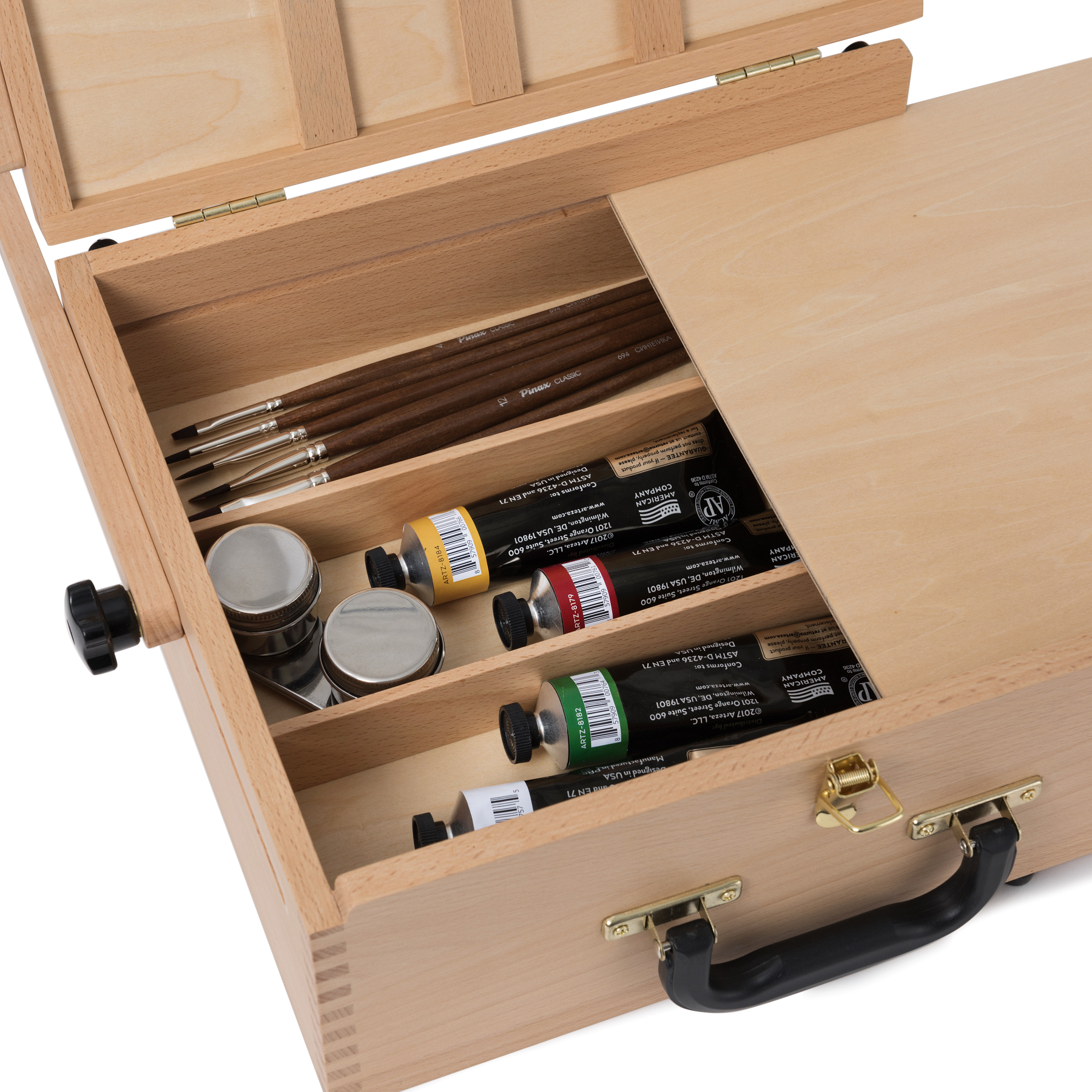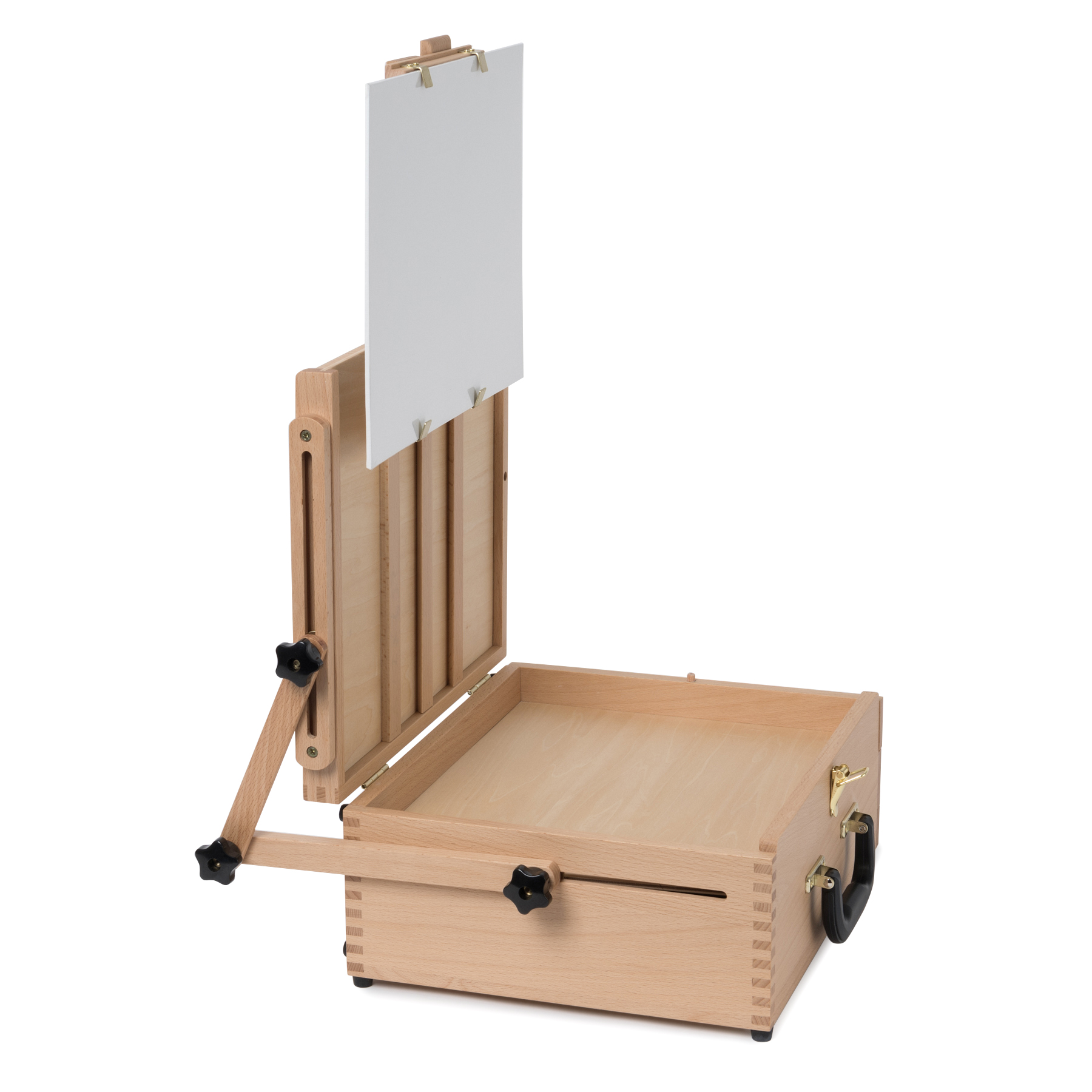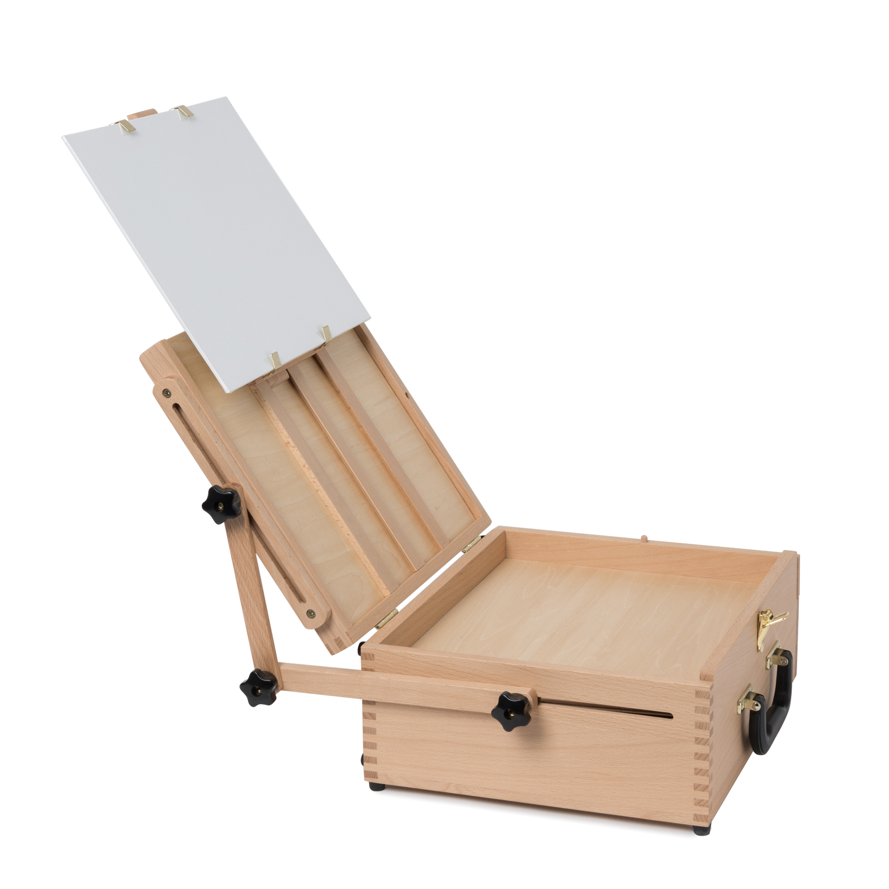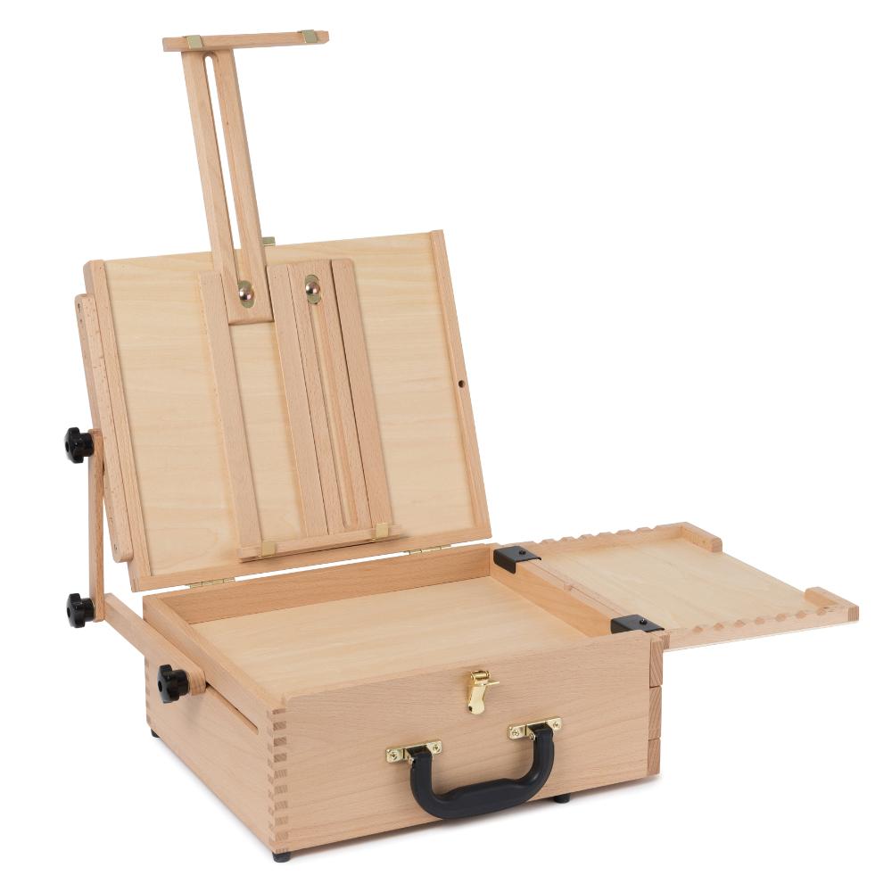 Этюдный ящик станет незаменимым помощником художника на пленэрах и в процессе работ вне студии. Конструкция этюдника предусматривает возможность установки холста максимальной высотой до 45 см., с регулировкой наклона и высоты нижней планки в широком диапазоне. Под сдвижной палитрой расположен удобный органайзер для кистей, красок и прочих принадлежностей, сбоку предусмотрен кассетник для запаса холстов на картоне, откидная полочка для кистей позволяет расположить рабочий инструмент рядом с работой, держатель для рулонного полотенца обеспечит удобство и чистоту в работе. На дне этюдника расположено штатное крепление на фотоштатив. Этюдник выполнен из бука, размеры 37,5х30х16 см. Данный товар представлен брендом Pinax. Pinax — мировой бренд товаров, который представлен на российском рынке с начала XXI века. Изначально компания производила только кисти для художественных работ, но затем расширила свое производство и не потеряв качество своей продукции начала производить холсты, мольберты и аксессуары для художников. Сейчас ассортимент включает в себя большое количество наименований. Размер основания: 33.4 ? 28 см. Диапазон высот: 41 — 60 см. Материал: промасленный бук Максимальная высота холста: 43 см. Размер упаковки 44 ? 36 ? 21 см. Вес брутто: 3.5 кг. *Товар поставляется без штатива.