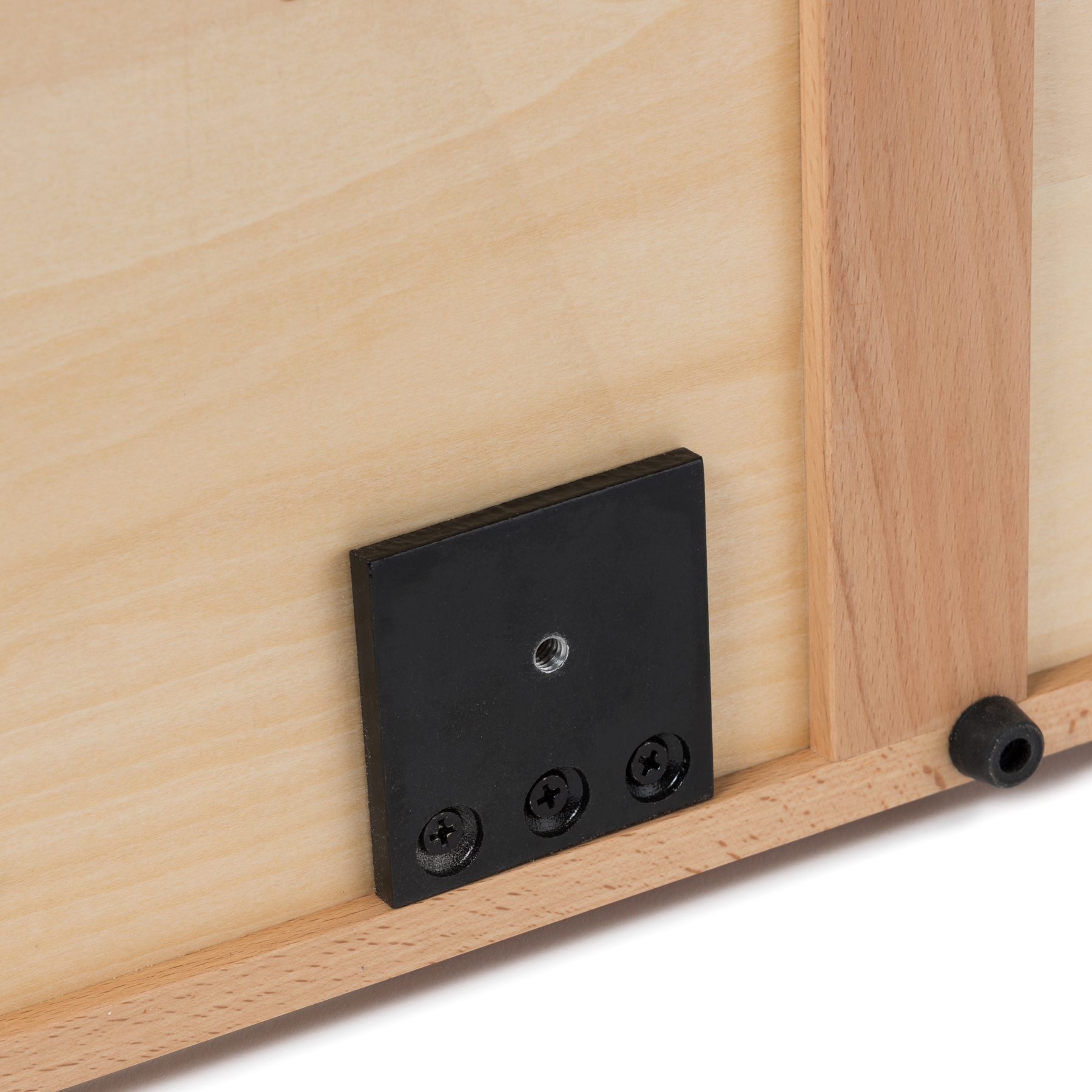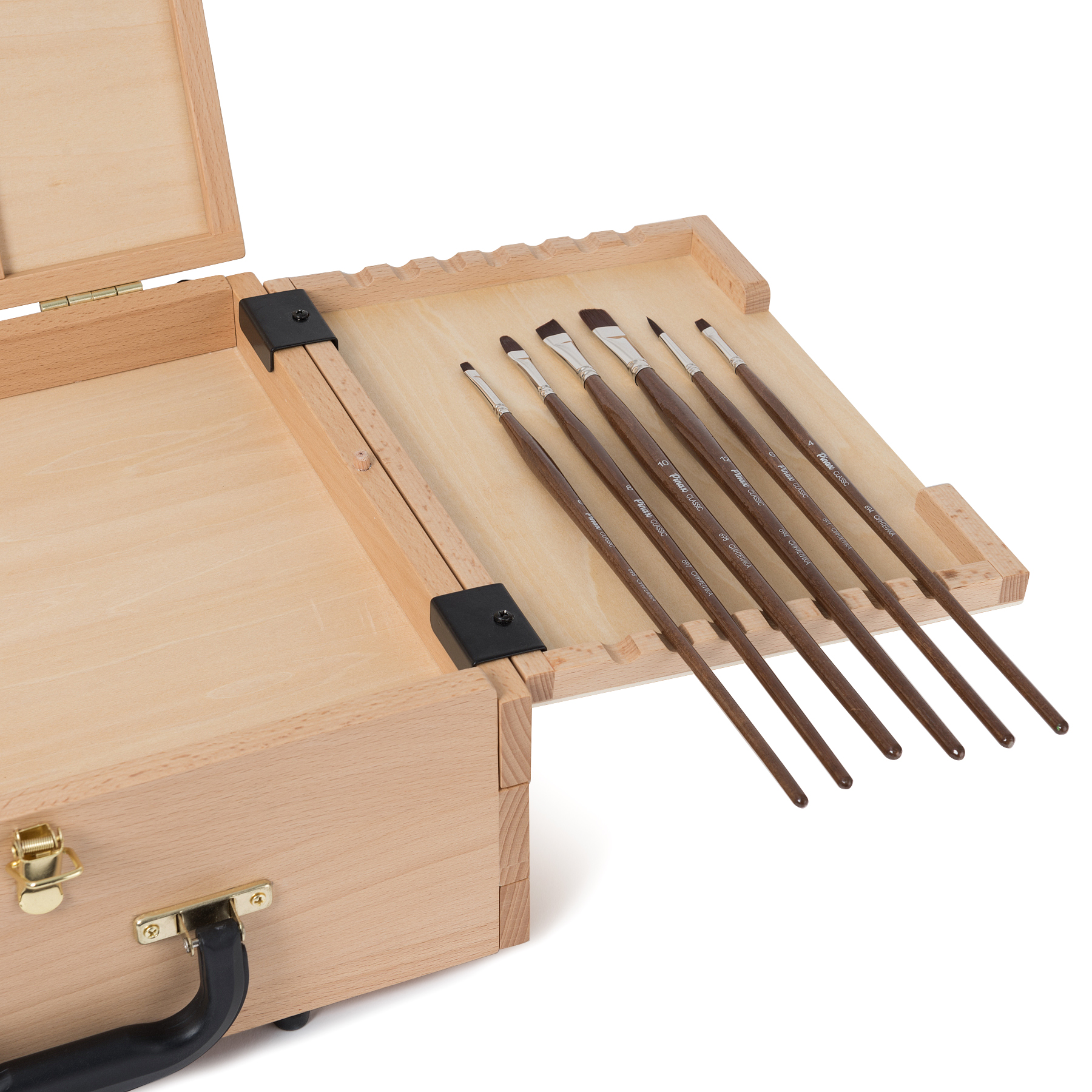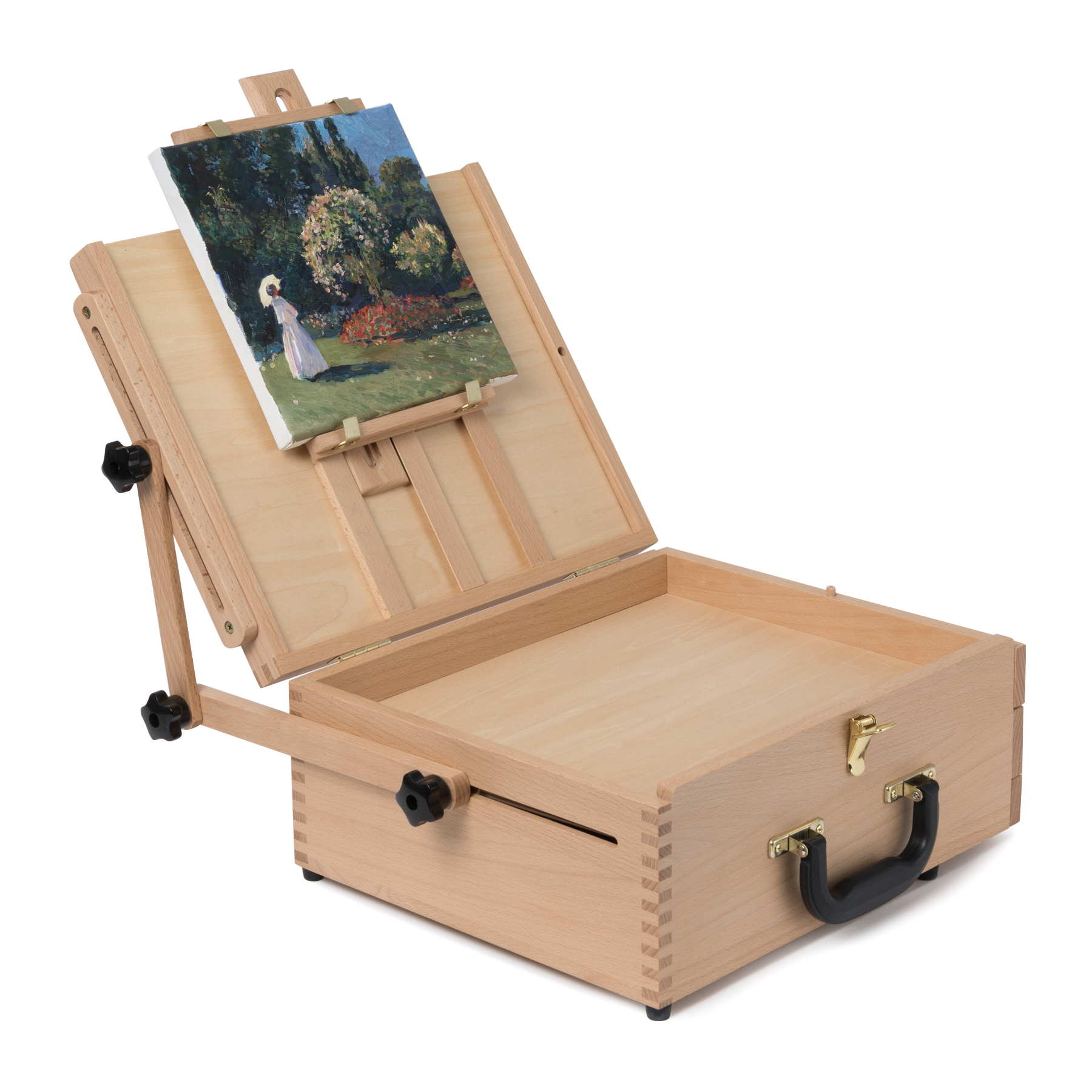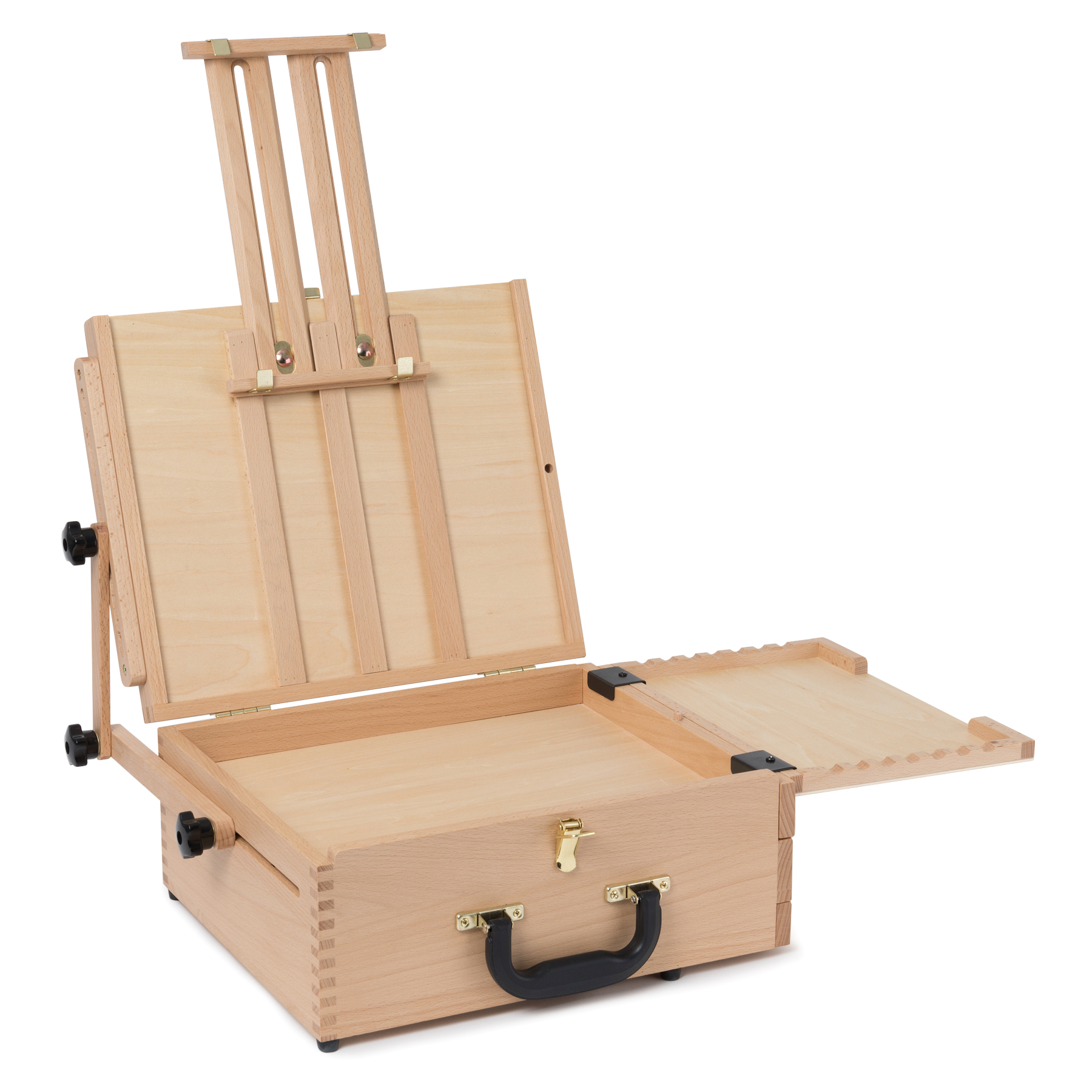 Этюдный ящик станет незаменимым помощником художника на пленэрах и в процессе работ вне студии. Конструкция этюдника предусматривает возможность установки холста максимальной высотой до 45 см., с регулировкой наклона и высоты нижней планки в широком диапазоне. Под сдвижной палитрой расположен удобный органайзер для кистей, красок и прочих принадлежностей, сбоку предусмотрен кассетник для запаса холстов на картоне, откидная полочка для кистей позволяет расположить рабочий инструмент рядом с работой, держатель для рулонного полотенца обеспечит удобство и чистоту в работе. На дне этюдника расположено штатное крепление на фотоштатив. Этюдник выполнен из бука, размеры 37,5х30х16 см. Данный товар представлен брендом Pinax. Pinax — мировой бренд товаров, который представлен на российском рынке с начала XXI века. Изначально компания производила только кисти для художественных работ, но затем расширила свое производство и не потеряв качество своей продукции начала производить холсты, мольберты и аксессуары для художников. Сейчас ассортимент включает в себя большое количество наименований. Размер основания: 33.4 ? 28 см. Диапазон высот: 41 — 60 см. Материал: промасленный бук Максимальная высота холста: 43 см. Размер упаковки 44 ? 36 ? 21 см. Вес брутто: 3.5 кг. *Товар поставляется без штатива.