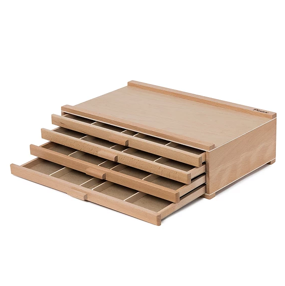 Компактный и удобный органайзер для хранения и транспортировки художественных принадлежностей и материалов. В органайзере предусмотрены четыре выдвижные полочки для распределения карандашей, пастели, кистей и прочих небольших аксессуаров. Органайзер выполнен из промасленного бука, размер 40x25,5x11 см.