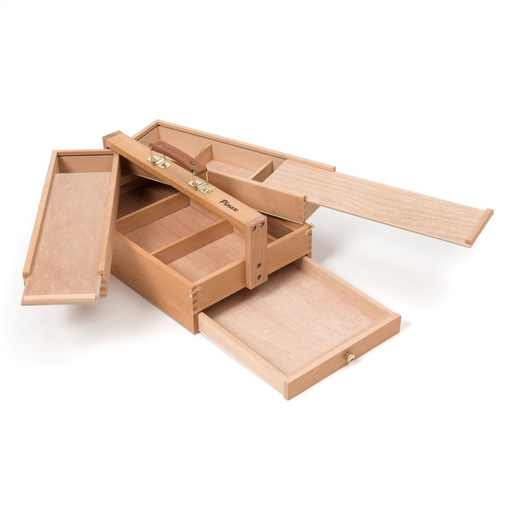Большой деревянный ящик для художественных принадлежностей Pinax с пеналами для кистей и красок вместит абсолютно весь арсенал художника. Благодаря выдвижным и раздвижным отсекам найти нужный предмет не составит труда. Механизмы трансформации и крепежи выполнены с идеальной точностью, что гарантирует долгий срок службы. Благодаря полированной поверхности и слою матового лака ящики для художественных принадлежностей Pinax отлично выглядят и легко отмываются от краски и других загрязнений. Размеры: 36*23,5*15 см