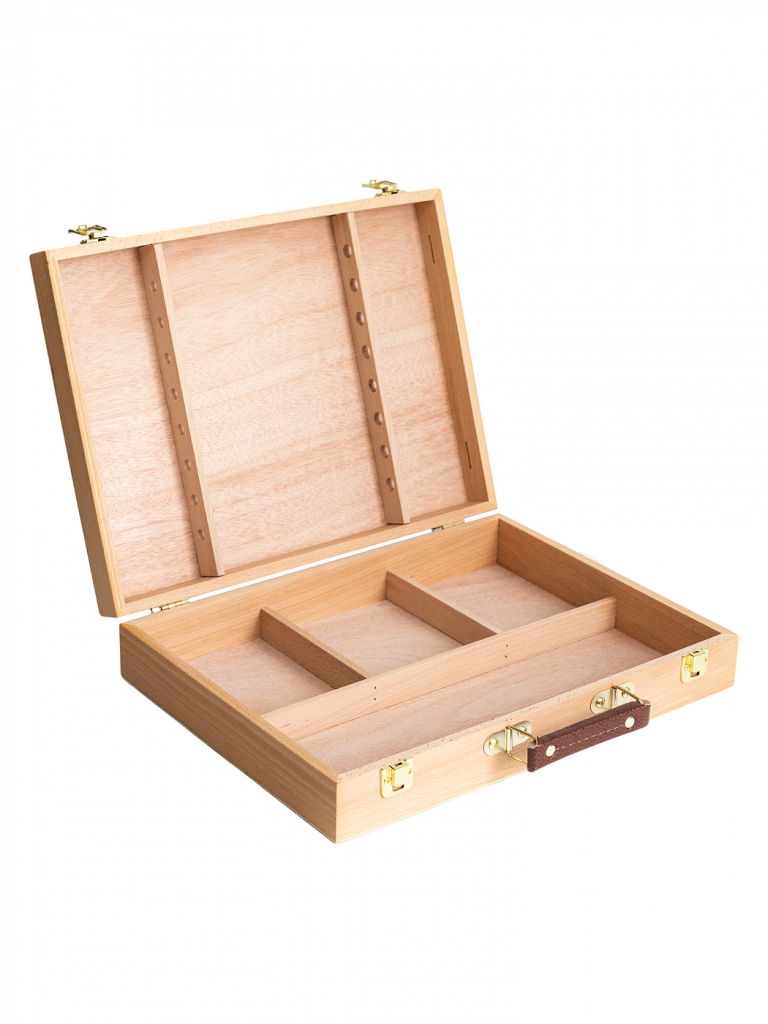 Ящик предназначен для хранения и переноски художественных принадлежностей. Имеет отделения для красок и специальные держатели для кистей. В комплект входит деревянная палитра для красок. Габариты: - В сложенном виде - 30х40х8,5 см - Палитра - 38х27,5 см (в комплекте) Внутри отверстия для кистей на длинной ручке и 4 отделения: - одно 38х12 см, - три по 15х12 см.