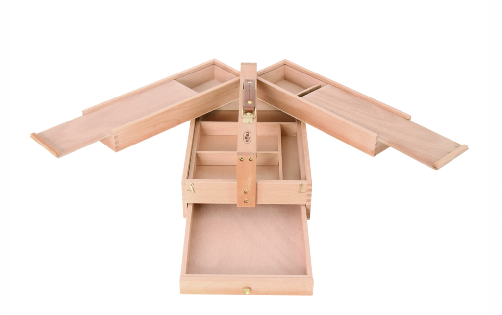 Помощник художника для организации инструментов и поддержания порядка на рабочем месте. Многоуровневая система хранения с выдвижным ящиком для кистей и красок. Ручка для переноса — удобно брать с собой. Размеры: 36x23.5x15 см.